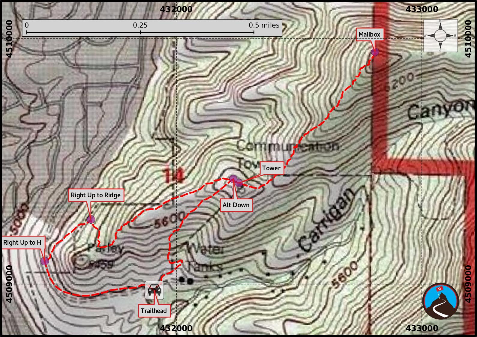 On the return, from the communications tower, a side trail dives steeply off to the south and back to the trailhead. This steep return makes a nice alternative to the route up and makes the return a bit shorter.