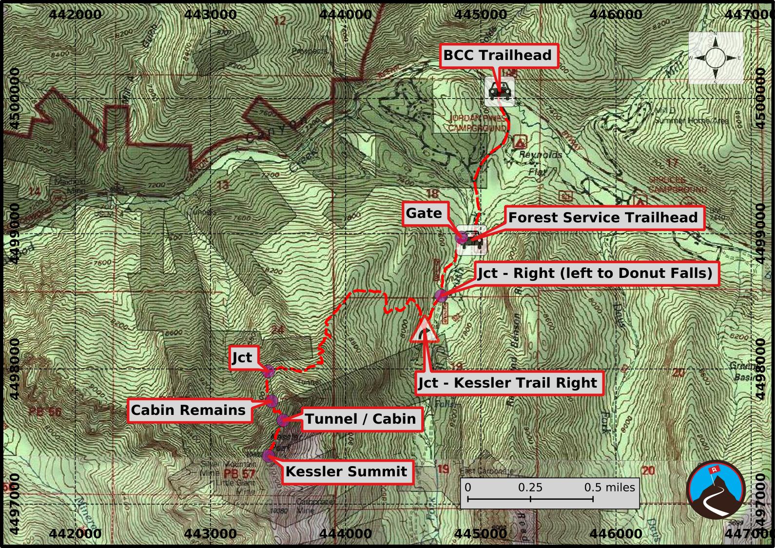 The Kessler Peak trail is unsigned but usually has a cairn at its base. It is about 0.2 miles from the Donut Falls side road junction. It is the only obvious trail leaving the road on the right in this section and has the appearance of being well travelled. A lone conifer tree on the left is a short distance up the road from this junction and is a good landmark to doublecheck. If you reach another side road joining on the left, you have gone too far.