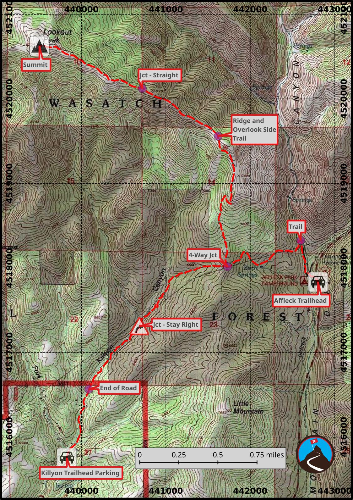 The route is commonly done from either Killyon or Affleck Park. The Affleck Park route is shorter than the Killyon approach, and in my opinion quite a bit better. It is a quick climb to the ridge and start of the excellent views. The downside to Affleck Park is dogs are not allowed in Mountain Dell Canyon, and thus not on that section of trail. The Killyon Canyon approach is longer and has more of a grunt to the ridge where it and the Affleck Park routes join, but since it is not in a watershed, dogs are allowed from the Killyon Canyon approach.