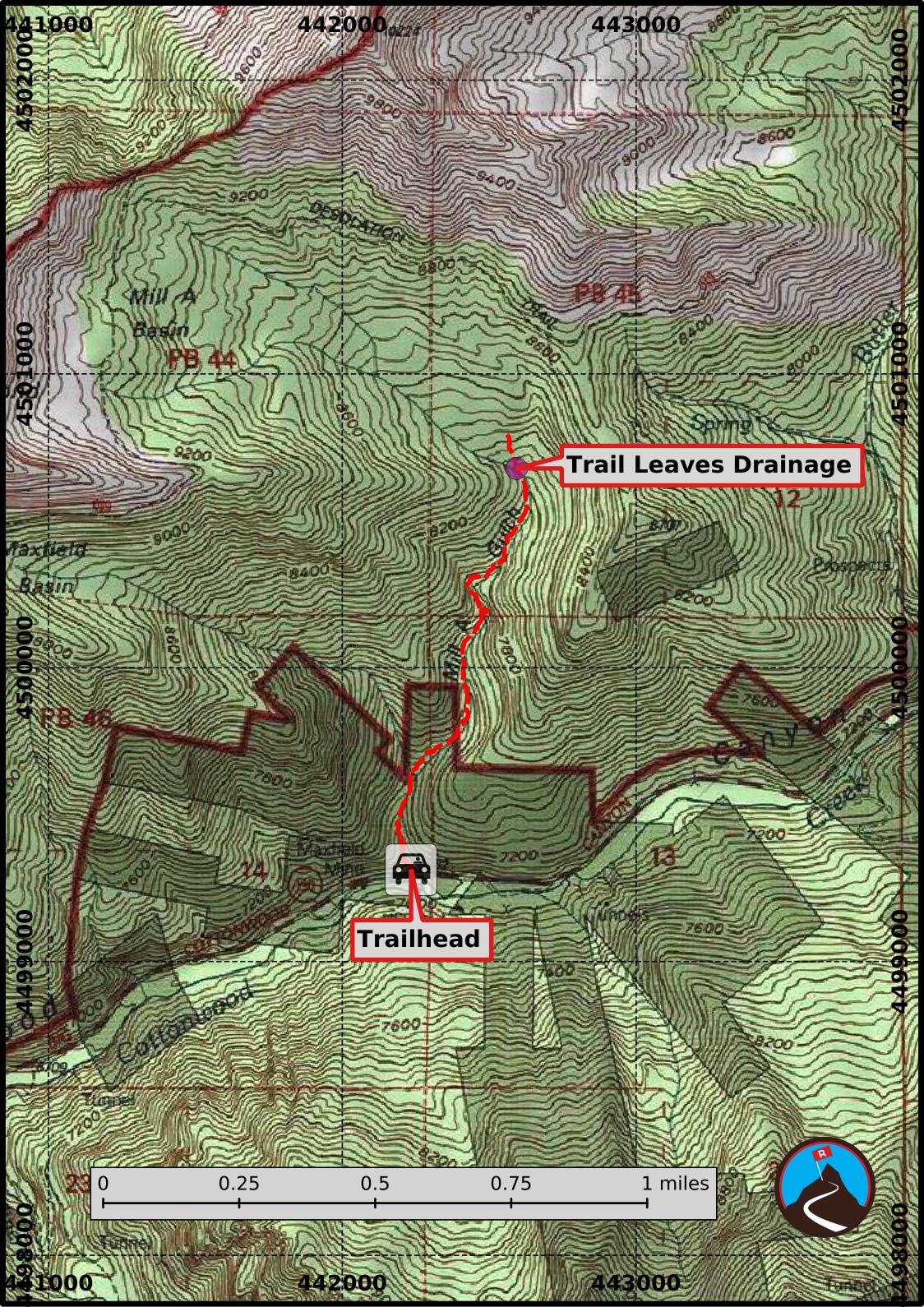 The trail disintegrates in the aspens and is my recommended turn around point. Motivated hikes can continue up the aspen slope on relatively easy terrain to join the Desolation Trail at about the 8600’ elevation line. This, however, requires good route finding.