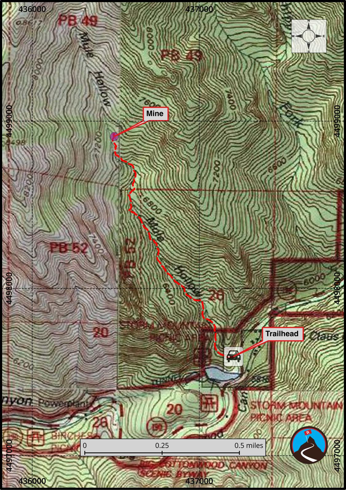 This is an easy trail to follow. From the trailhead, follow the most used trail as it heads north up Mule Hollow. Stay on the main trail in the bottom of the hollow. It is generally dry for a short distance where the stream has gone underground, but as you continue higher, the stream reappears. In very high runoff, you may get your feet wet, but in most seasons it is easy to rock hop and use many strategically placed logs to keep your feet dry.