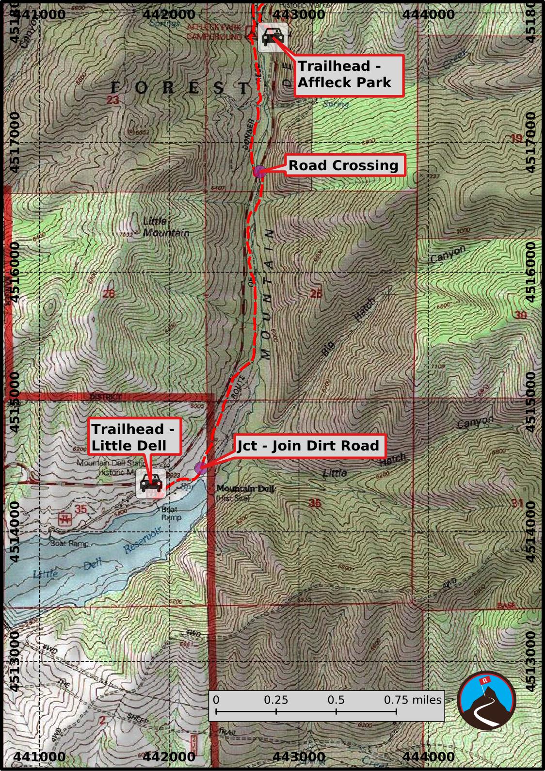 Continue from Little Dell an additional 2.4 miles to Affleck Park on the left. Affleck Park is a great camping area. Reservations required in advance, contact Salt Lake County ( https://www.slc.gov/utilities/watershed/affleck-park-campground/ ) for more information. The trail passes through the park on the west side of the stream. You can park on the road and walk-in.