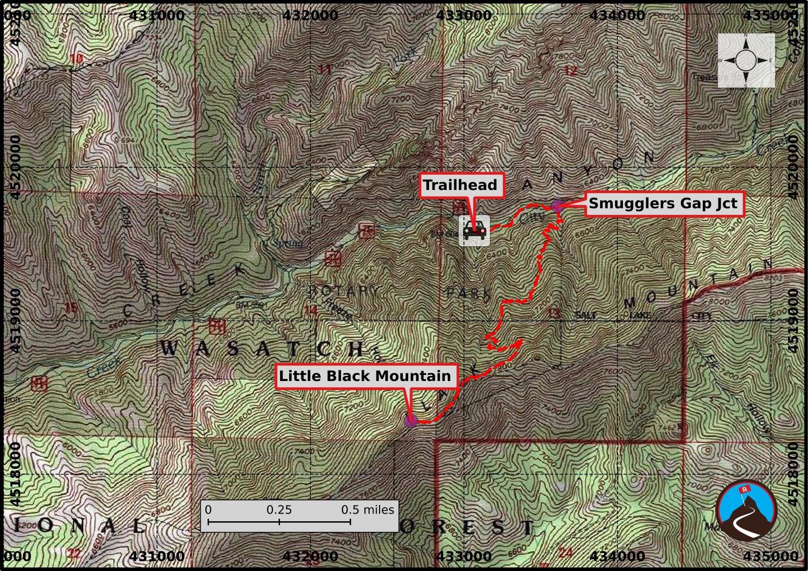 At the ridge, the trail splits and becomes less used. Left continues east along the ridgeline, deep into the Upper City Creek area and eventually to Lookout Peak. Right heads west and visits the Little Black Mountain summit in about 0.5 miles. The trail along the ridge to Little Black Mountain is less defined than the Smugglers Gap trail, but still easy to follow. There are no obstacles or exposure to reach the summit. Return the same way.