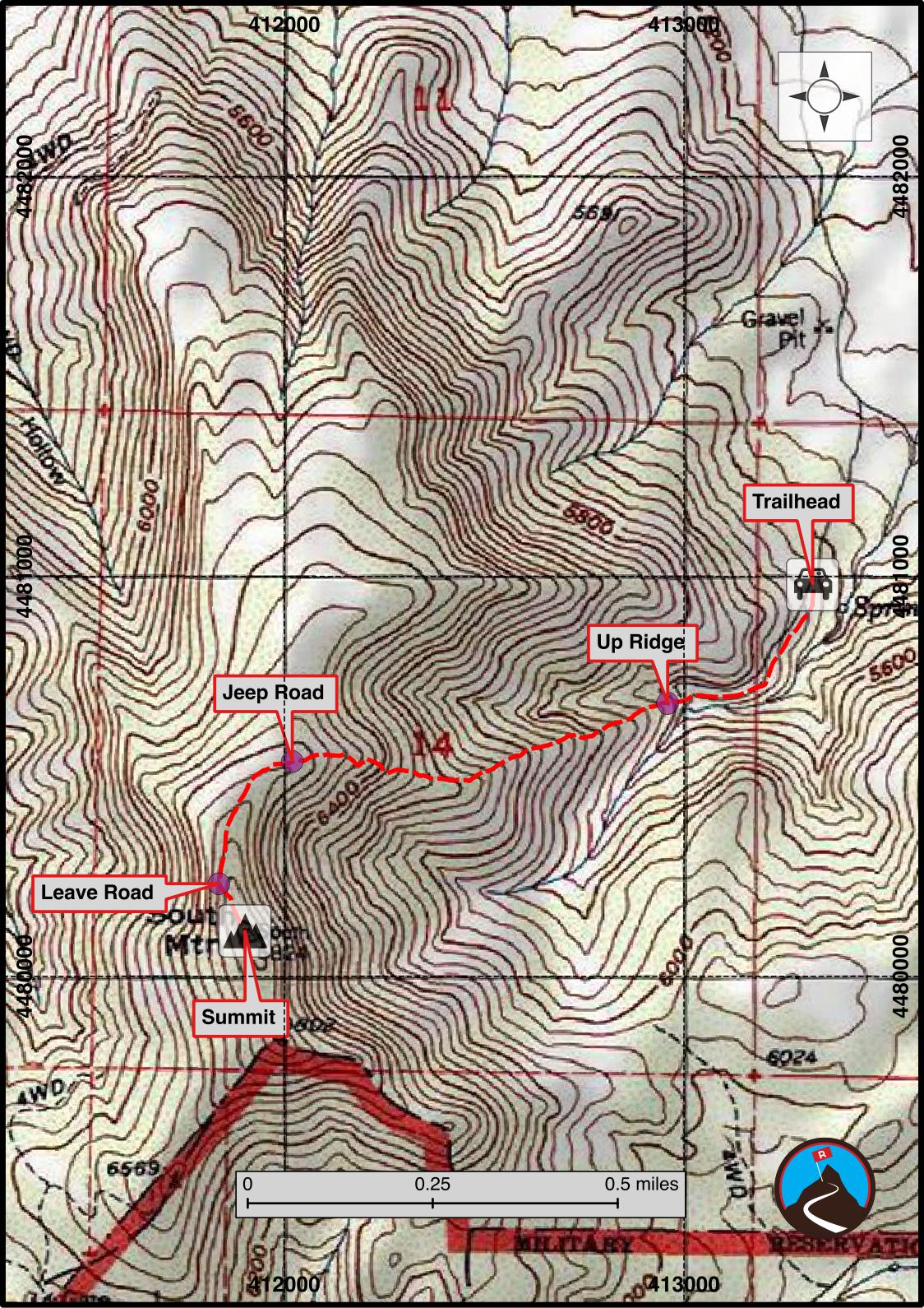 From the parking area, follow the utility road south into the canyon within a few minutes, a fenced utility area is reached at the end of the road. A social trail continues from here, with the summit due south. The easiest approach is to follow the social trail that begins on the south side of the fence. This is a hiker/game trail that quickly climbs through the underbrush and works up the ridge. Follow it to the main ridge proper.