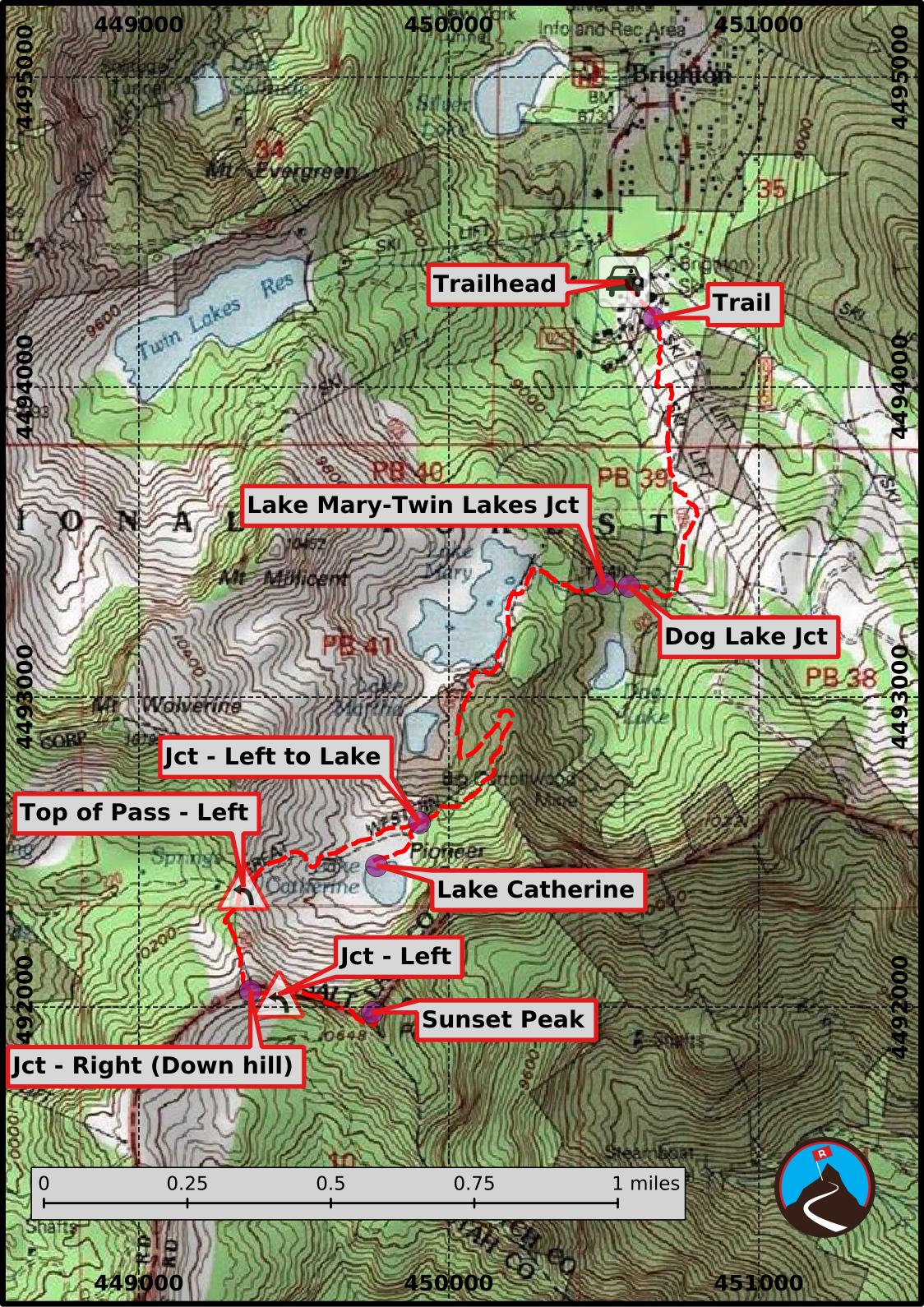 From the Brighton parking lot, go just right (south) of the main Brighton building. A path leads up the slope, then heads right and passes between large logs to become a single narrower track. The single track switchbacks up the hillside, crossing under the ski lifts, before heading more south. After a short steep section is a junction to Dog Lake.