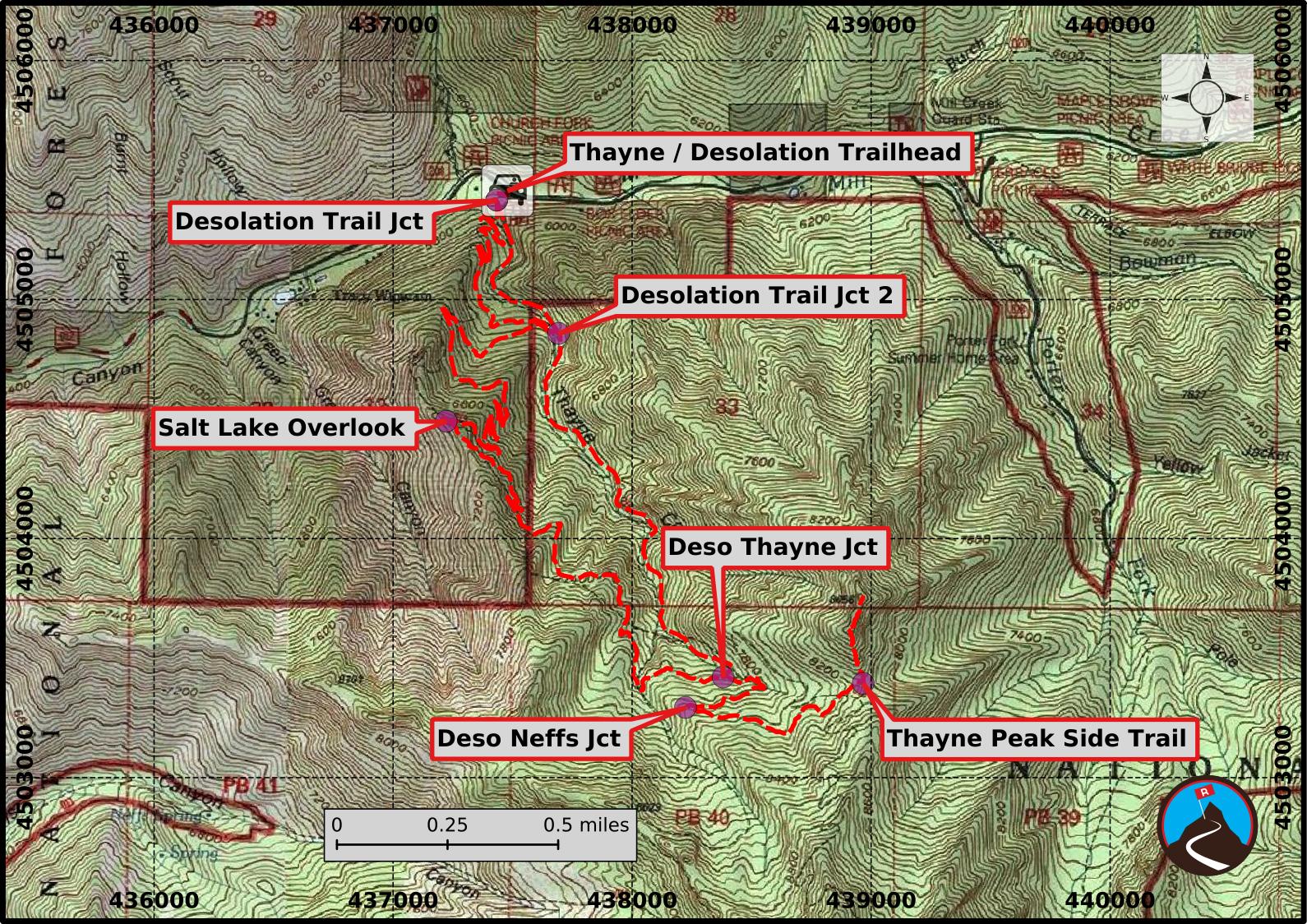 From the Thayne/Desolation junction continue up hill on the Desolation trail. It will pass another major junction after one long switchback. Stay left here. Right climbs up to the ridge and heads down Neff's Canyon.