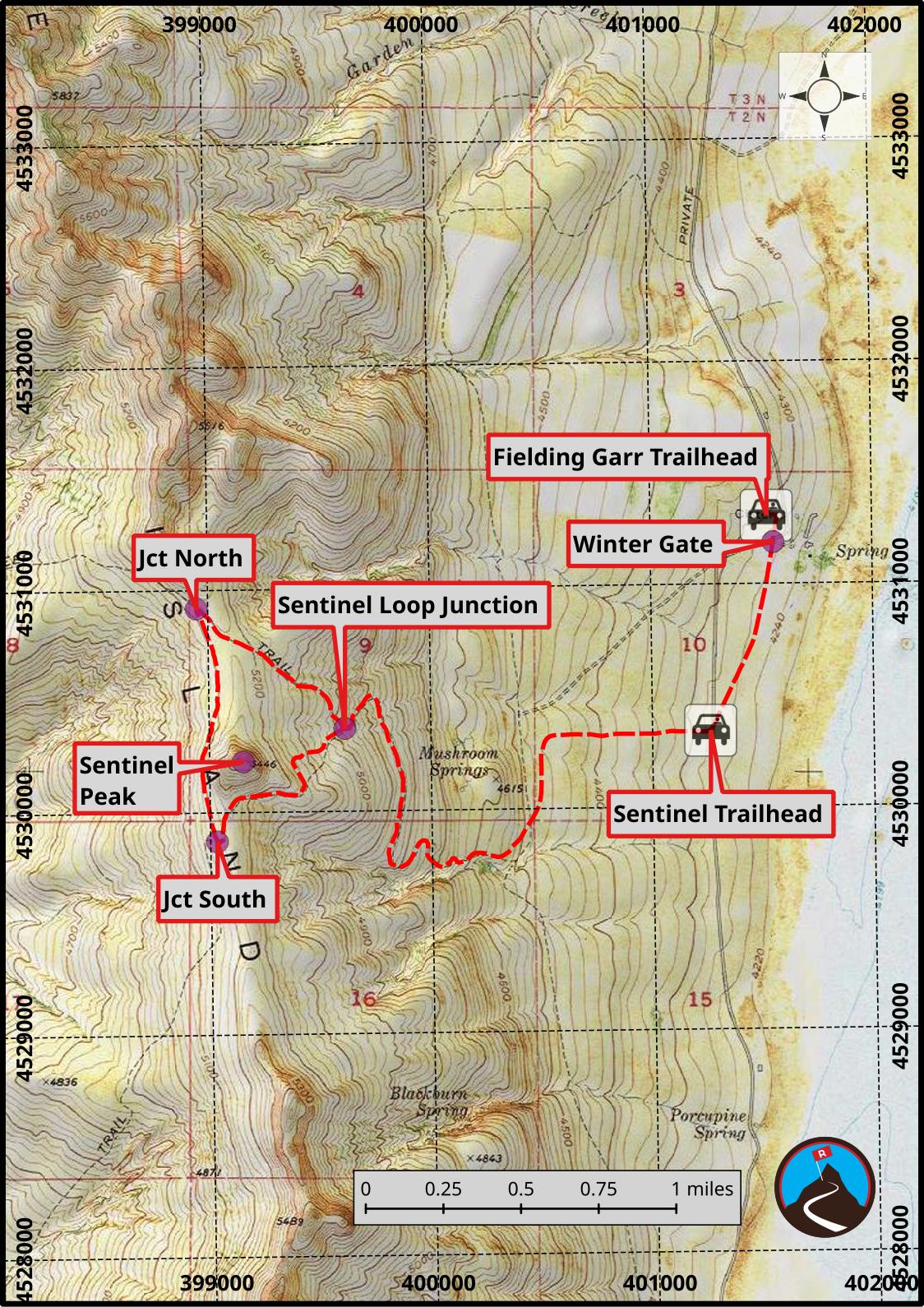 If hiking in the winter when the road is closed, and starting from the Fielding Garr Trailhead, head south on the road which turns to dirt at the gate, and follow it for 0.6 miles to the Sentinel Trailhead.