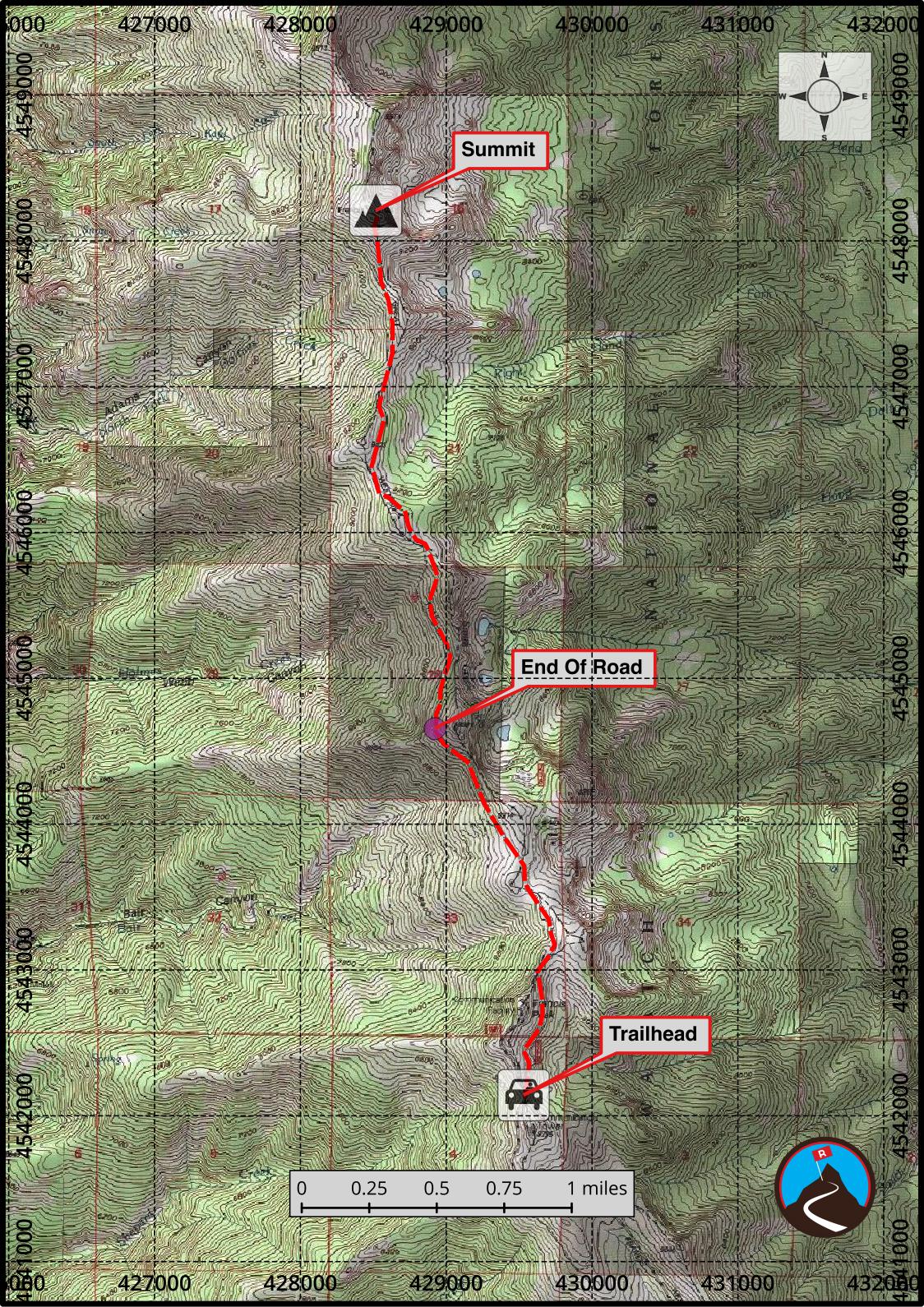 Follow the single track as it runs the ridge line, starting on the west side, then crossing over to the east side to avoid several sub-peaks. About 2.5 miles (60 minutes from the end of the road), Thurston is on the right, with the trail making a fairly level traverse along its east side. Leave the main trail and follow a social trail up the south ridge to the true summit. (Many options.)