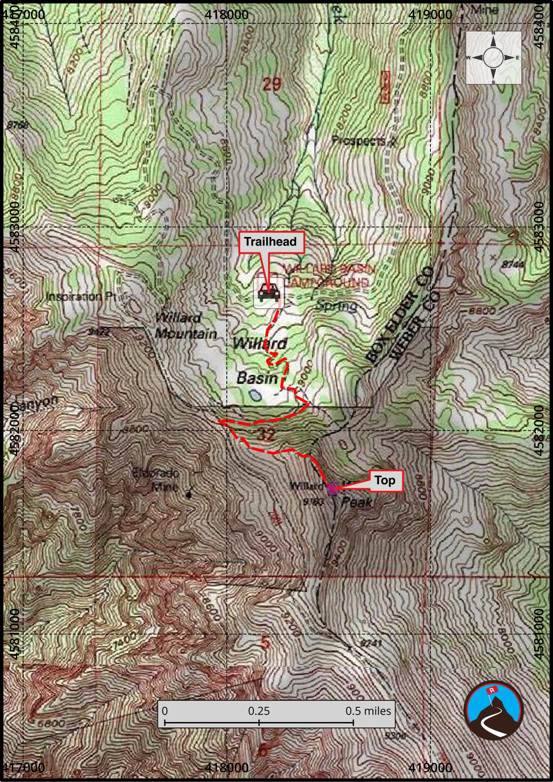 From the trailhead, look south and you can see an old road angling up the hillside from the left to the right. Follow one of many use trails south from the trailhead as they meander and merge up to the old road. Follow the old road up to where it tops out on the shoulder of Willard Peak. (3/4 of a mile and 500' of elevation)