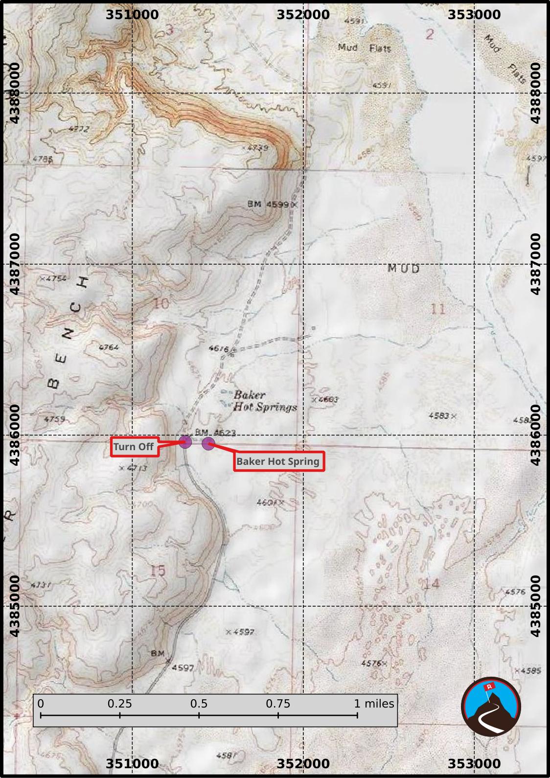 Follow Jones Road for 9 miles to a T intersection at the power plant. Go left here for 11 miles to the junction with Baker Hot Springs Road on the right. The road turns to dirt, but is well graded and should be passable for all vehicles. Follow the excellent dirt road 7.2 miles to the hot springs on the right.
