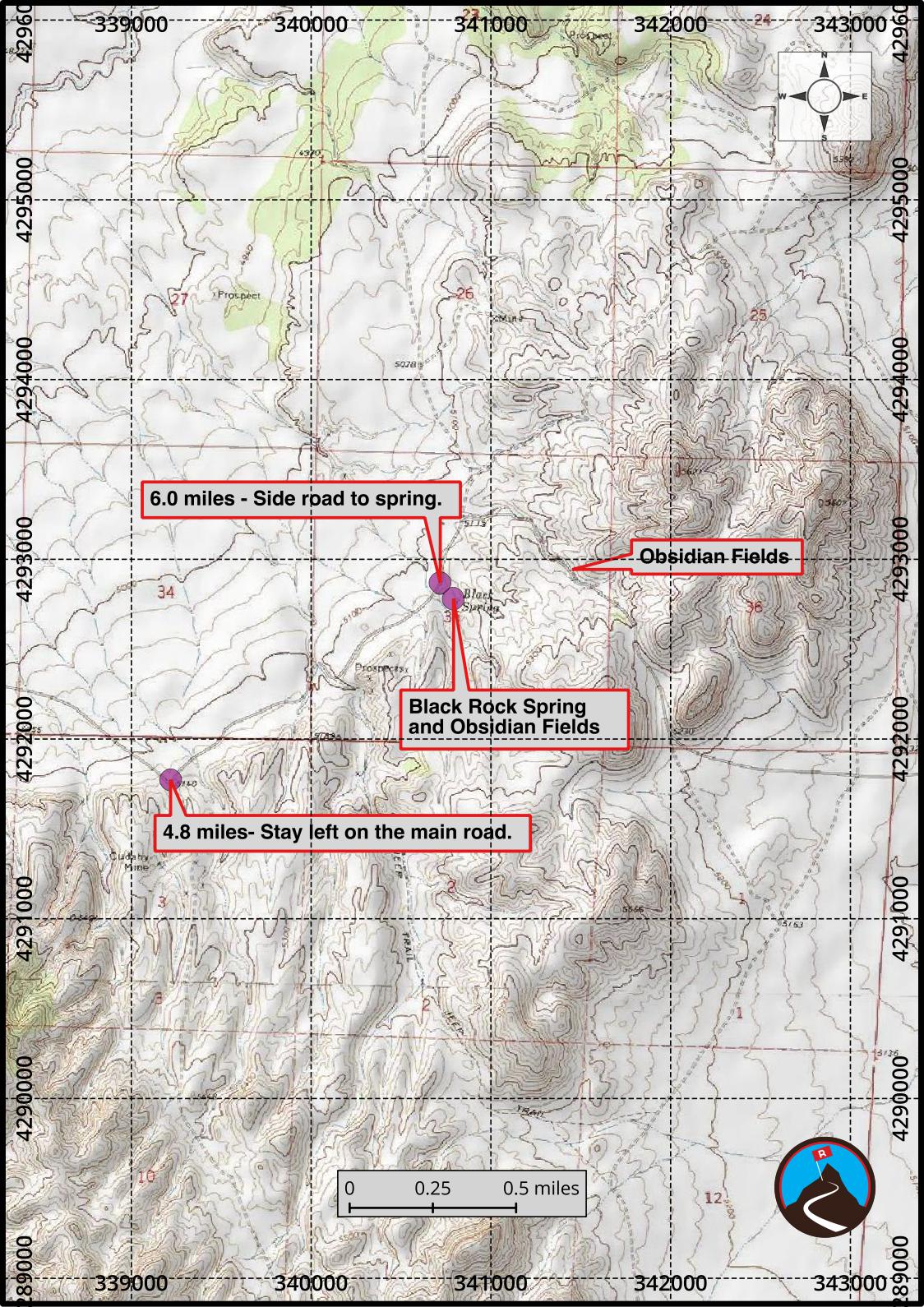 From the spring, wander around the spring and main road. There are patches of obsidian dotting the hillsides.