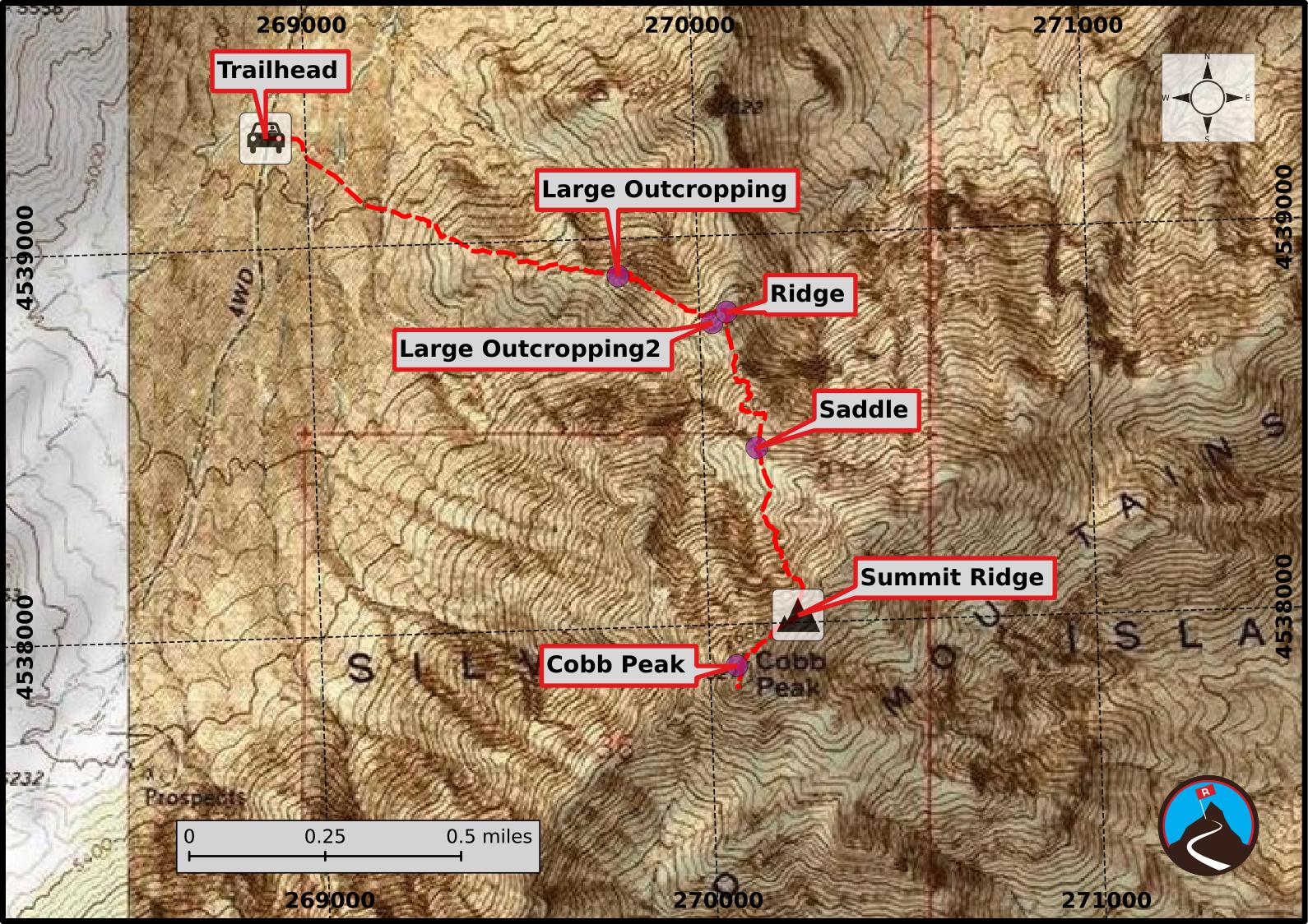 Soon you can see the ridge becomes steep rock. Look for a small "saddle" between the ridge on the left, and a rock outcropping on the right. At the saddle, you can see Cobb Peak high above to the south. You can also see many options here to work up to the summit. From the saddle, I traversed south to a steep, loose, rocky, and small drainage. I followed the drainage up to the ridge proper, then a short ridgeline hike to the summit of Cobb. Phew!