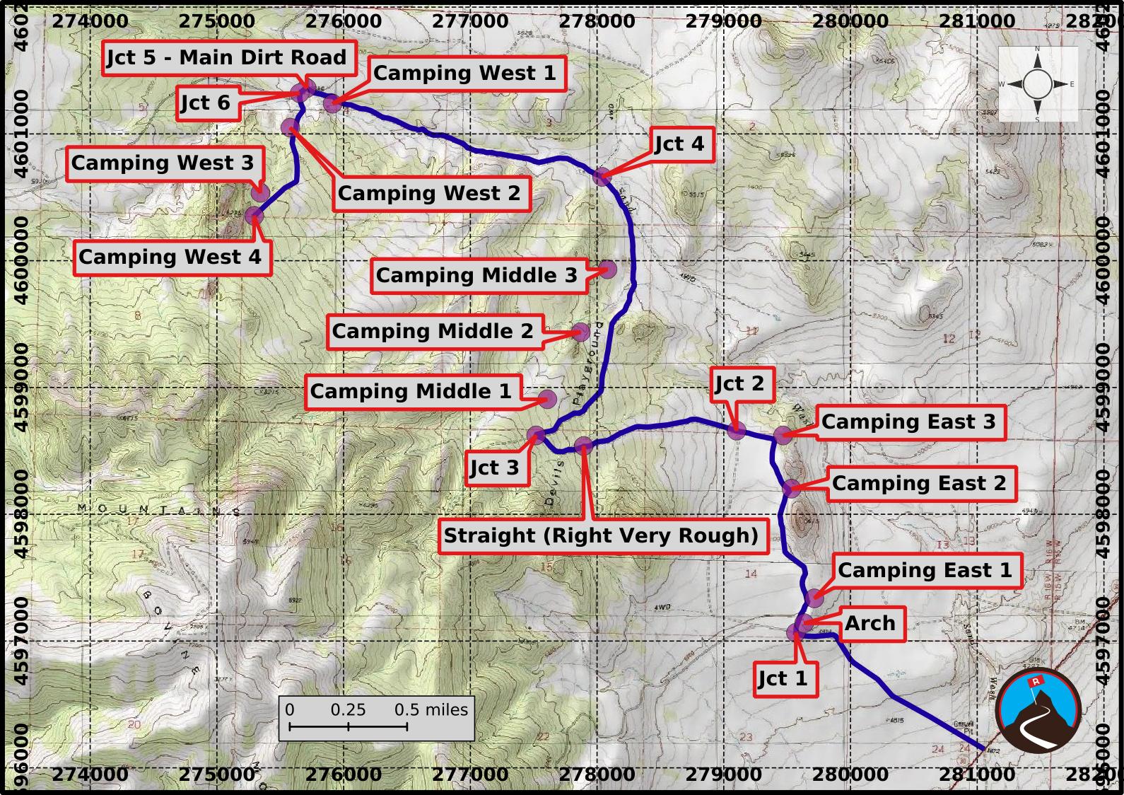 Aside from the large arch marked on the map, there are many other small solution pockets and arches. Keep an eye out.