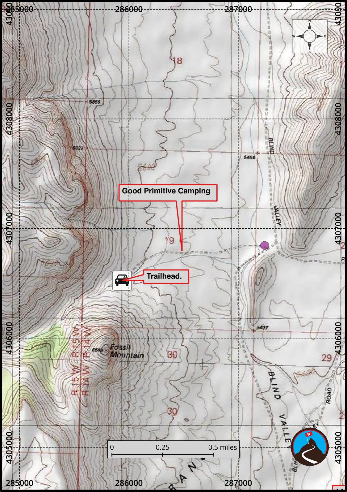 From the trailhead, your best bet is to wander south up the slope of Fossil Mountain 200 or see feet of elevation gain should put you in the fossil zone. The map is purposely vague to encourage wandering.