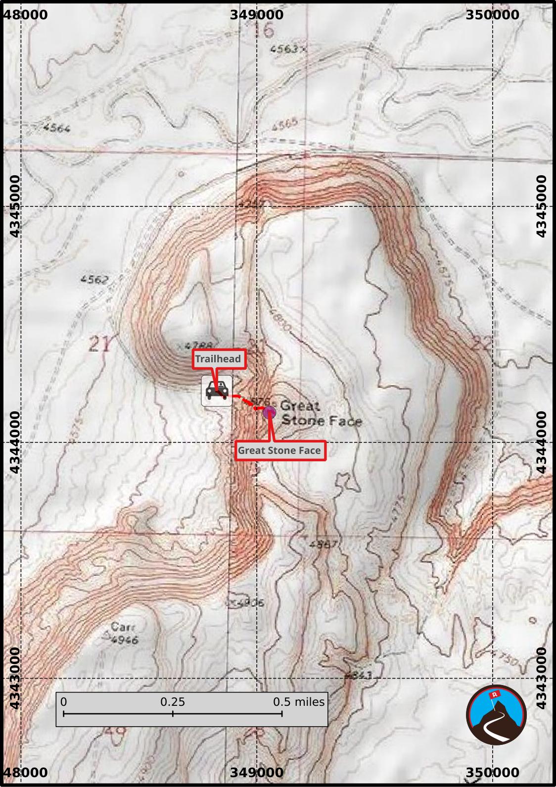 Visiting the stone face requires a short but steep hike up a somewhat loose trail. The feature that looks like a face is on the west/southwest side, though I thought it was hard to spot.