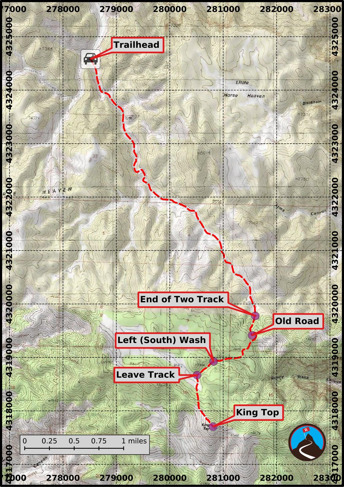 King Top, at 8350 ft / 2545 m, is the high-point of the range, and a worthy goal for those interesting in exploring the area. Some reach King Top from the east, via Bonny Stairs Canyon. This description uses an old gas exploration road that comes in from the north. Using this route, the hike is about 11.5 miles, but easy hiking on an old road with little route finding or brush to contend with.