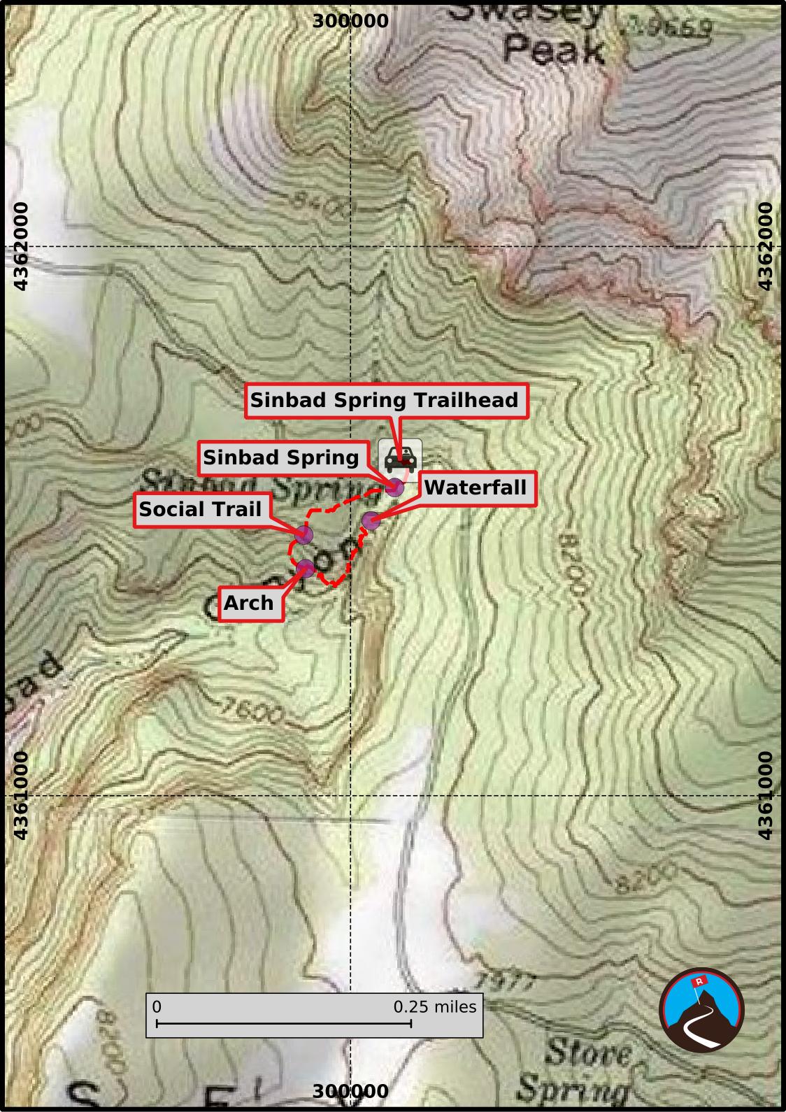From the road, head downhill toward the drainage. The spring, with a livestock trough, is on the right a couple of minutes below the road. To visit the waterfall from the top, continue down from the spring just a couple of minutes. There is one down climb (on the left looking down canyon) before getting to the top of the falls proper.