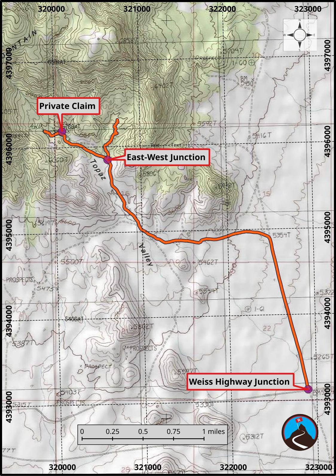Turn right onto Topaz Rd and go 1.7 miles. This side road crosses the Weiss Highway after a 1/2 a mile, then becomes a bit rougher. Once across the Weiss highway, it is generally signed for Topaz Mountain.