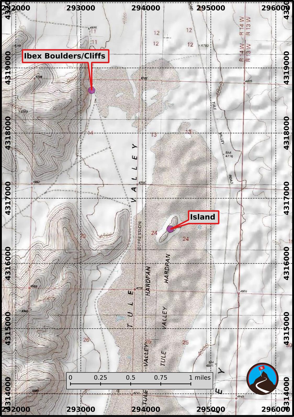 The driving directions give end at the Ibex Crags. There are many good campsites along here, as well as a dirt road the goes north and south along the cliffs. South provides access to the largest area of the hardpan. There is a rocky island jutting out in the middle of the hardpan that is a fun short hike to visit. There is often a flag on its summit.