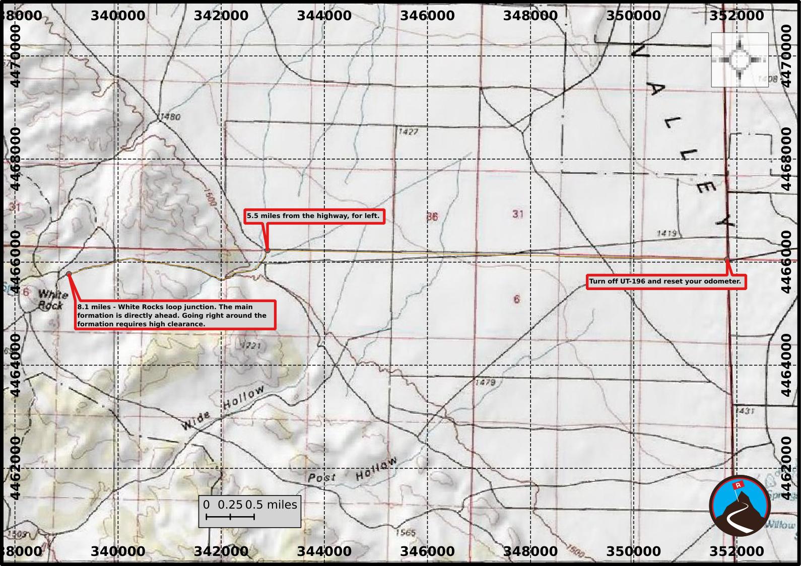 When approaching White Rocks, there are many excellent campsites on the south and west sides of the main rock formation. The north side requires high clearance.