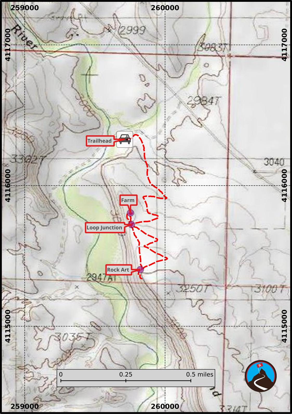Be sure when visiting the rock art to watch your step. There are many panels carved on boulders in the ground that could be easily walked on in you are not paying attention. Also, be sure to hike down off the ridge to the west and through the boulders. There are many panels and glyphs on the rock along the cliff.