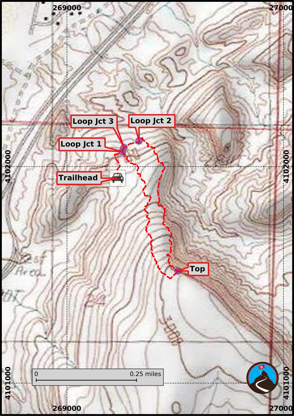 To make a loop, continue the trail north past the flagpole as it stays near the edge of the small cliff band. The trail meanders down and reaches a junction. Go left here to loop back to the start trailhead.