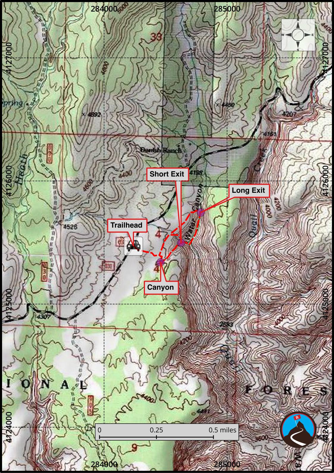 Where the canyon opens, look up on the left. There is one area that looks broken and passable. This is the short exit. Head up to the broken area, where you find a surprisingly simple game trail that meanders to the top. Nothing over class 3 in this section, and less than 20 minutes from the canyon bottom back to the trailhead. Once on top, you hit the road you follow back to the trailhead.