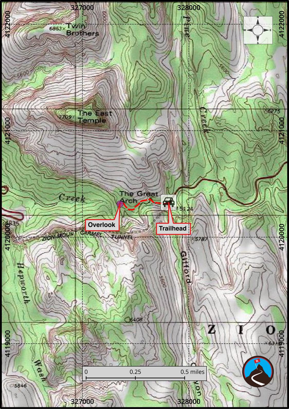 As the trail nears its end, the Great Arch wall is visible to your right, with the large open area of the southern portion of Zion National Park visible straight ahead. An orientation sign at the overlook points out the major peaks visible to the west and main features. Return the same way.