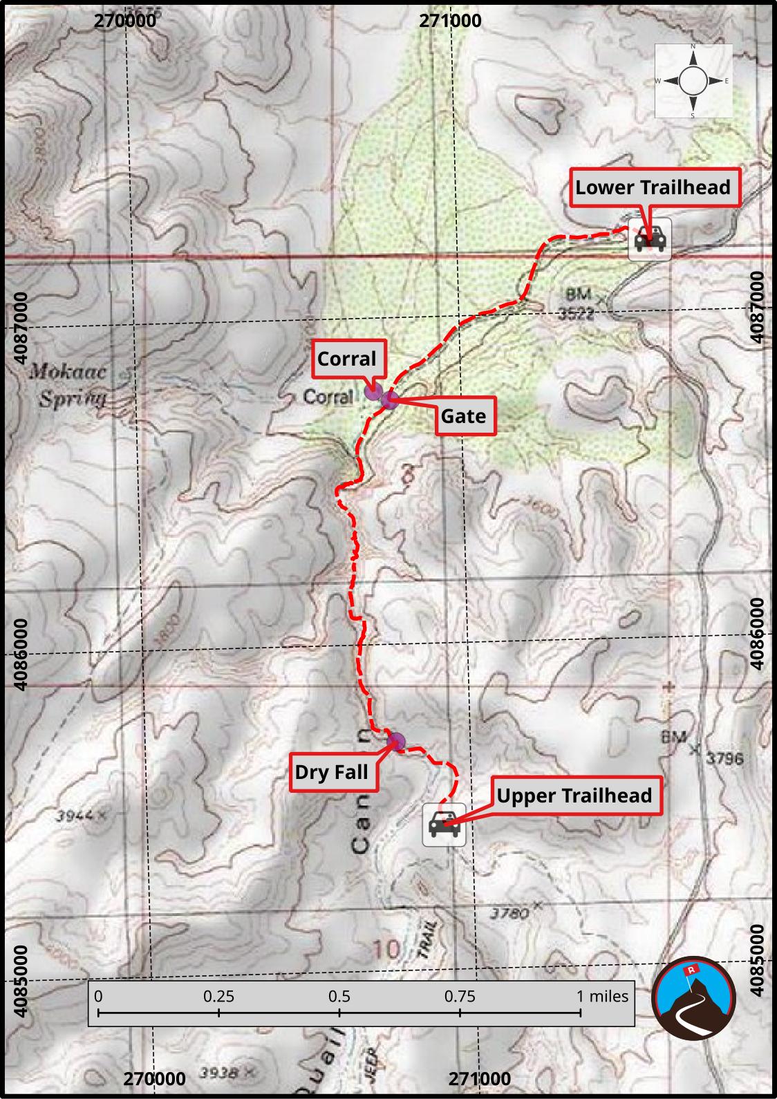 7.8 miles from UT-7 is a spur road on the right that goes down hill. This is the lower trailhead. Park either along the main dirt road, or go down the side road 100 feet or so to a gate where there is a small parking area for a handful of cars.