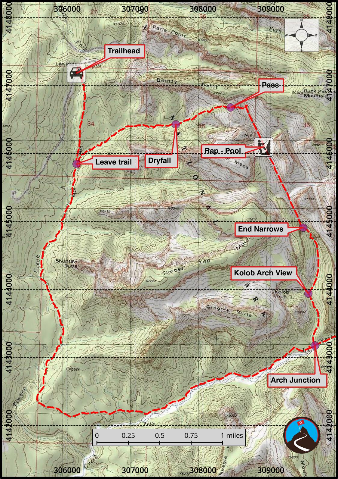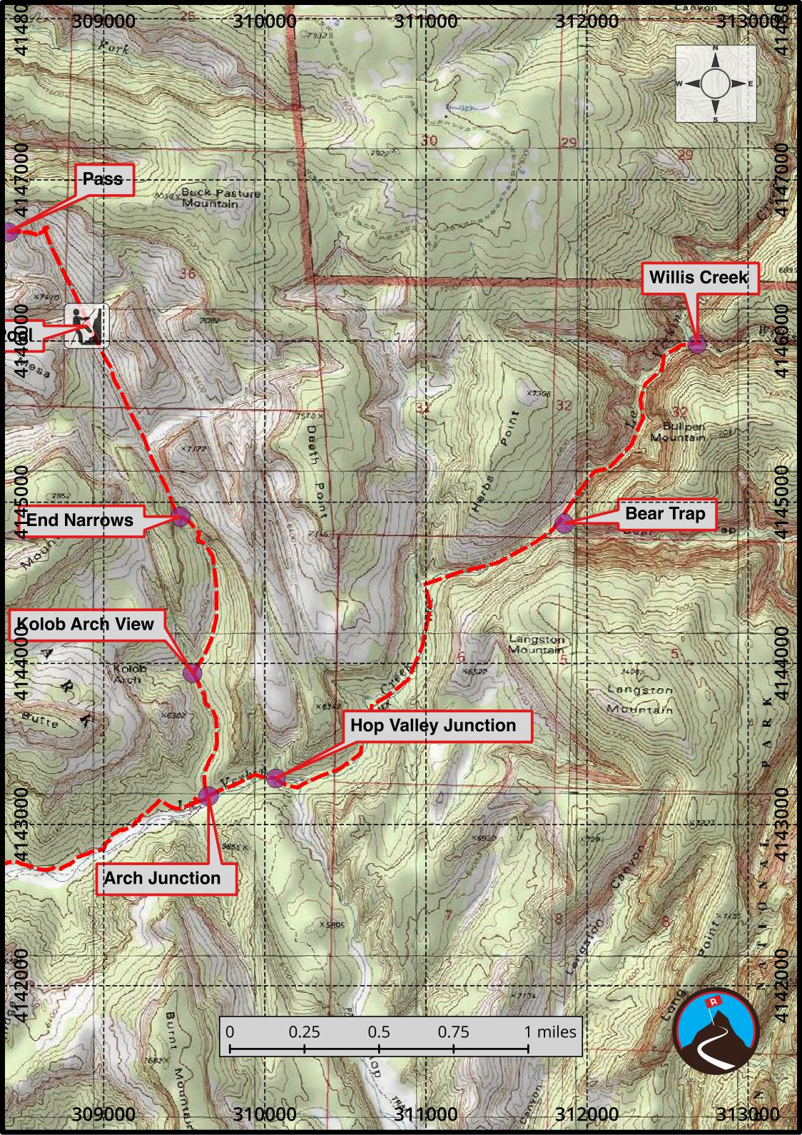From the viewpoint, it is an easy to follow park trail. Follow it 0.5 miles to the junction with the La Verkin Creek trail, then turn right and follow the La Verkin trail about 6 miles and 800' of elevation gain back to the Lees Pass Trailhead.