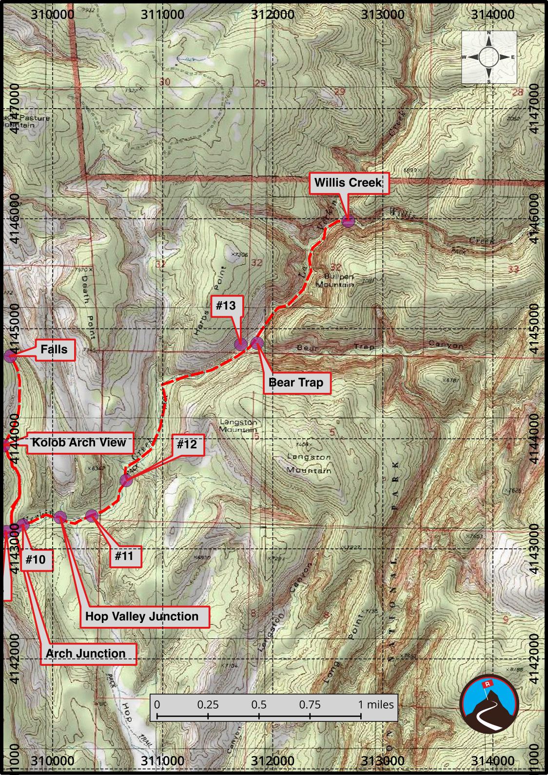 If continuing up La Verkin Creek from Bear Trap, it isn't far to Willis Creek, where the trail bends to the right, ascends Willis, and ends at the National Park Boundary.
