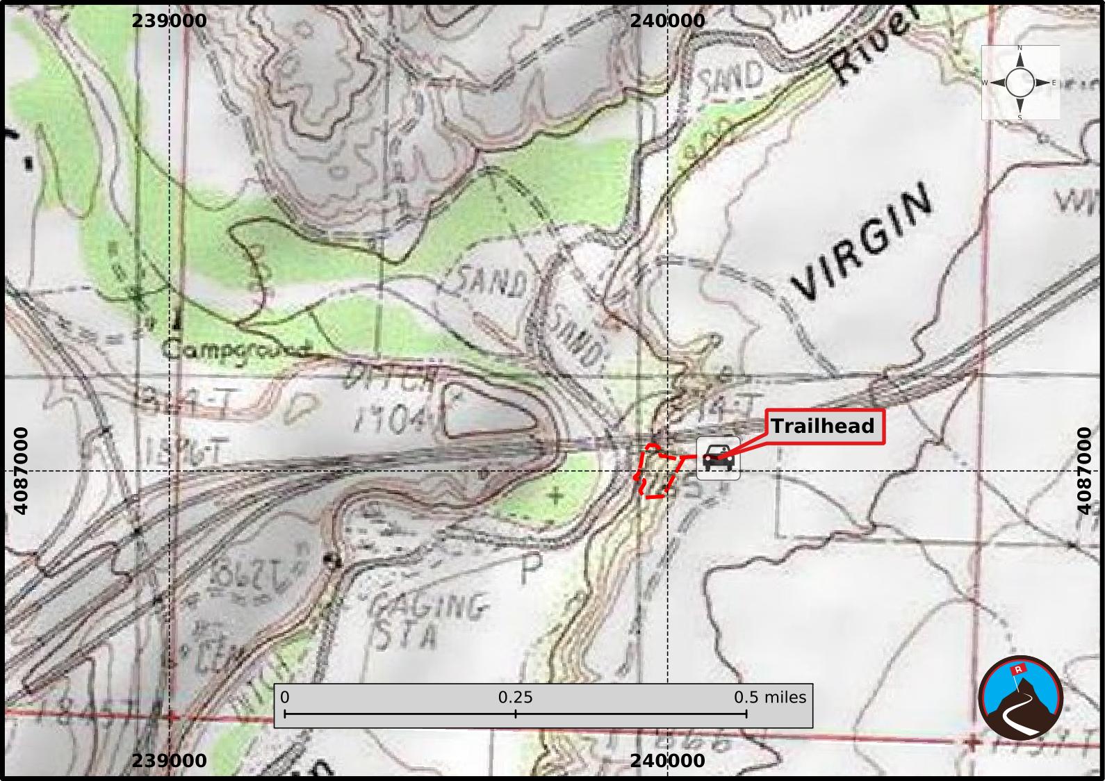 Take exit 9 off I-15, then turn right onto Farm Rd. Follow Farm Rd west for 0.3 miles to its end in a large dirt parking area.