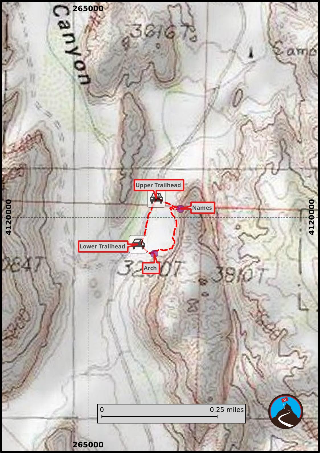 The trail can be done as a one-way through hike with two cars, though it is short enough, that just walking the road back to your vehicle is easy enough. If just visiting the pioneer names proper, this is a short 10 minute out and back hike.