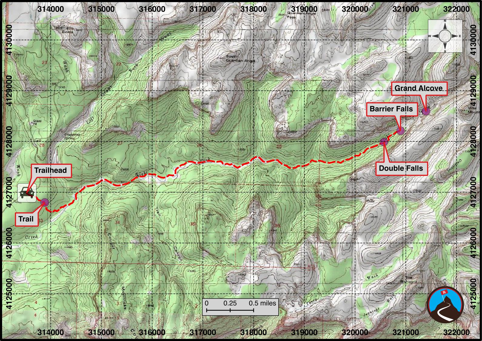 Unfortunately, just when the Right Fork starts becoming very interesting and pretty, Barrier Falls lives up to its name and blocks upstream travel. The Grand Alcove is tantalizingly close above Barrier Falls, but out of reach of hikers.
