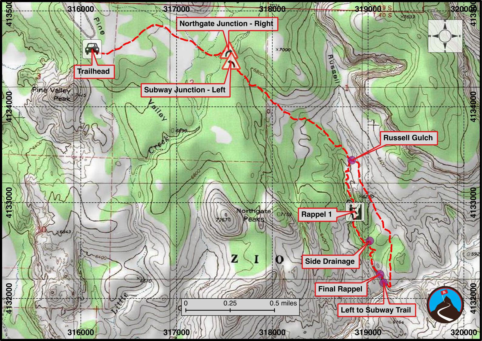 From where the trail crosses Russell Gulch, head down Russell Gulch. The first drop is easy to bypass on the right. Continuing down, most of the water is easy to bypass with strategic rock hopping. The first rappel is just down from the first unavoidable pool. Suit up before the pool is wearing wetsuit.