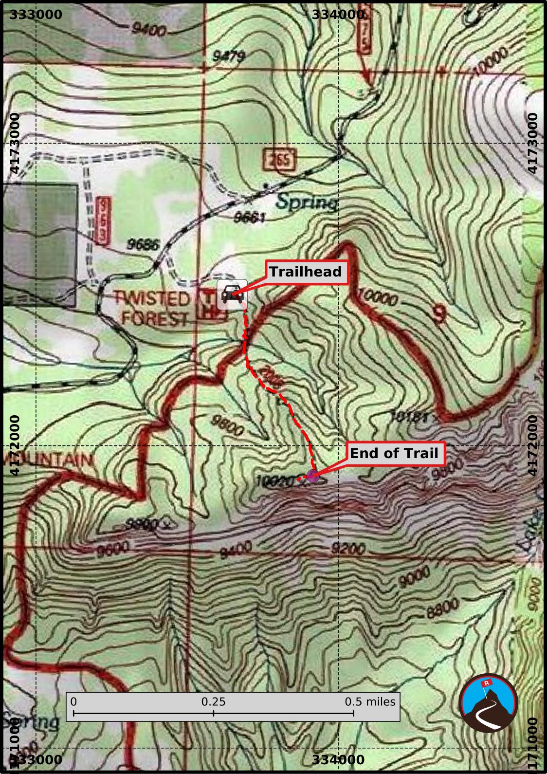 The trailhead is off UT-143 between Brian Head and Cedar Breaks National Monument. To reach the trailhead, go left off UT-143 at mile post 16.35. This is about a mile south of the town of Brian Head, or a couple of miles north of Cedar Breaks National Monument. The dirt road is signed Twisted Forest Access, and generally passable by all vehicles when dry. There are many side roads and spur roads used for camping. Stay on the main road.