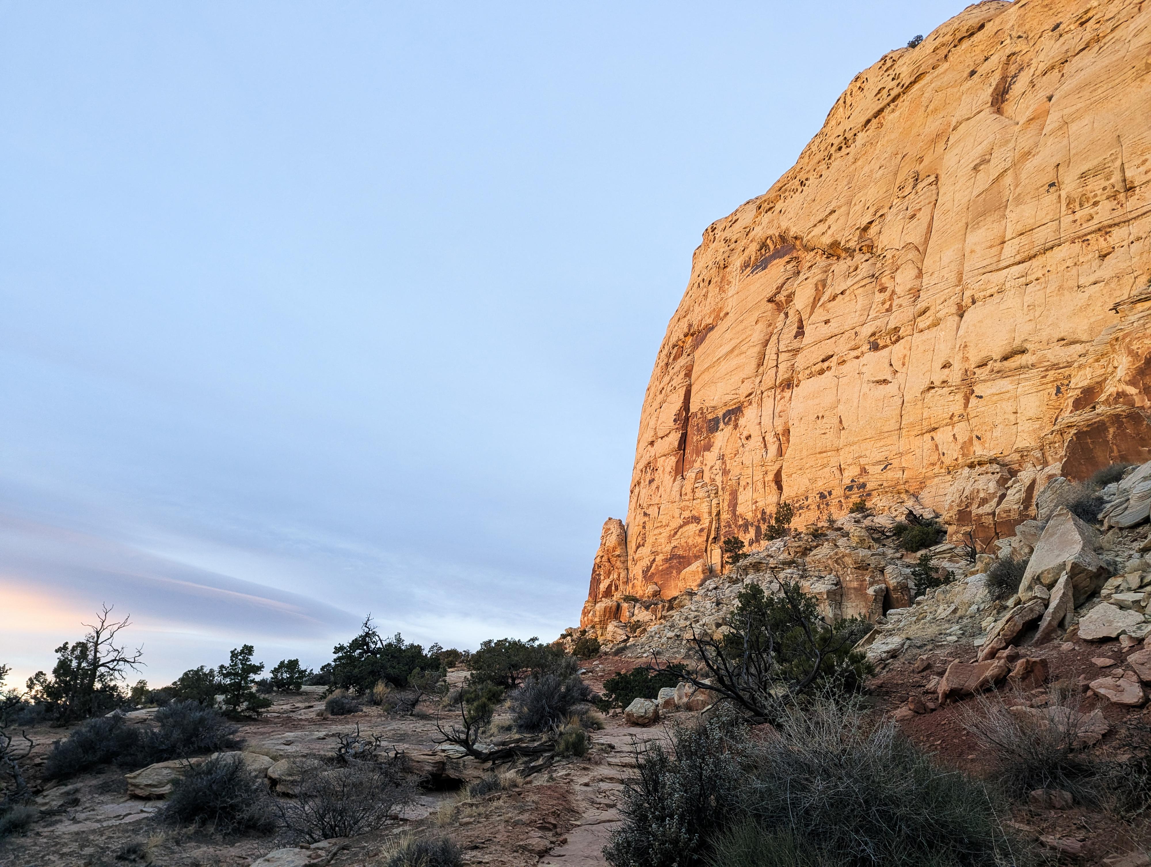 Morning light starting on the cliffs along the trail.