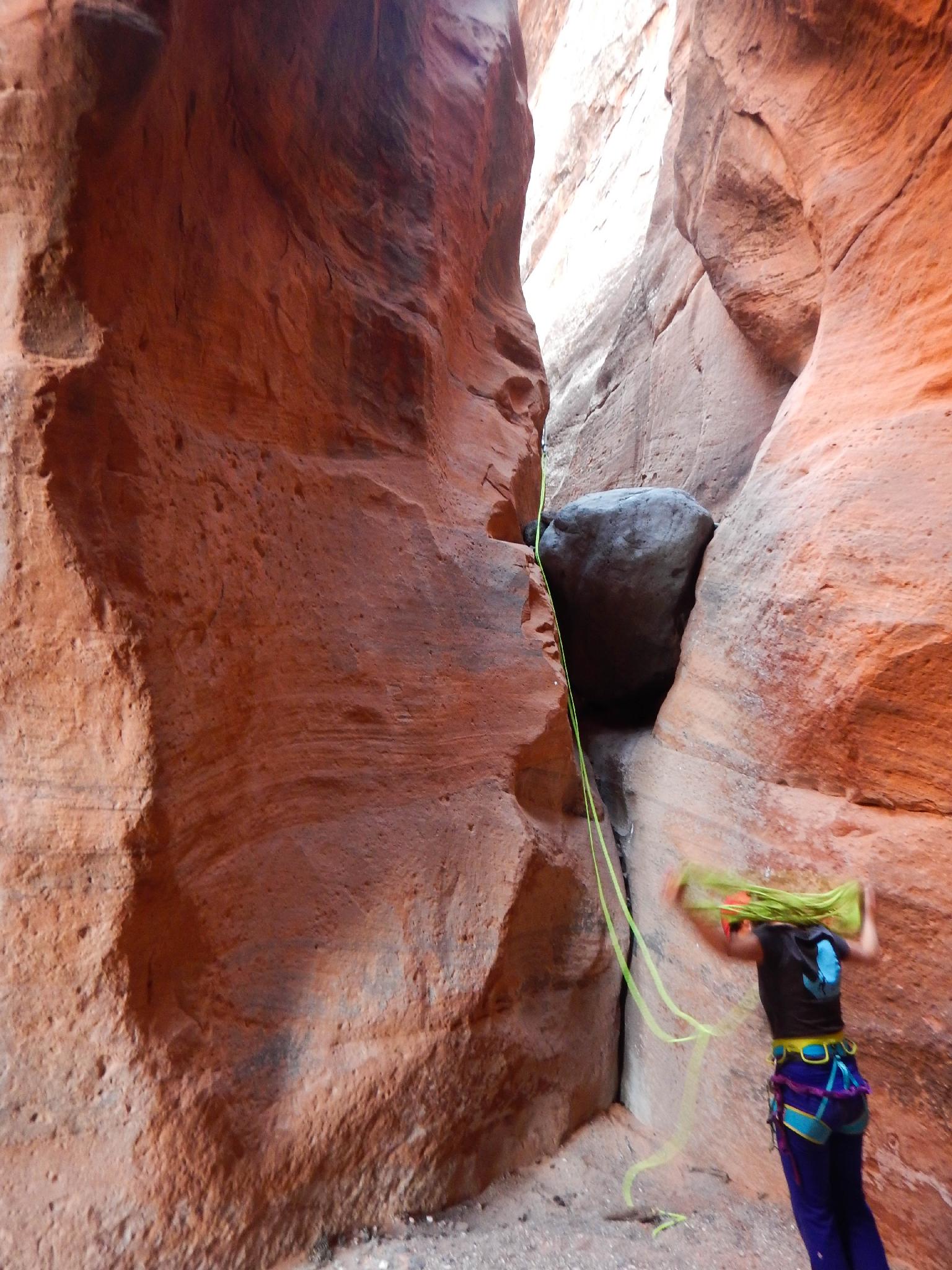 Diane coiling the rope after rappel 2.