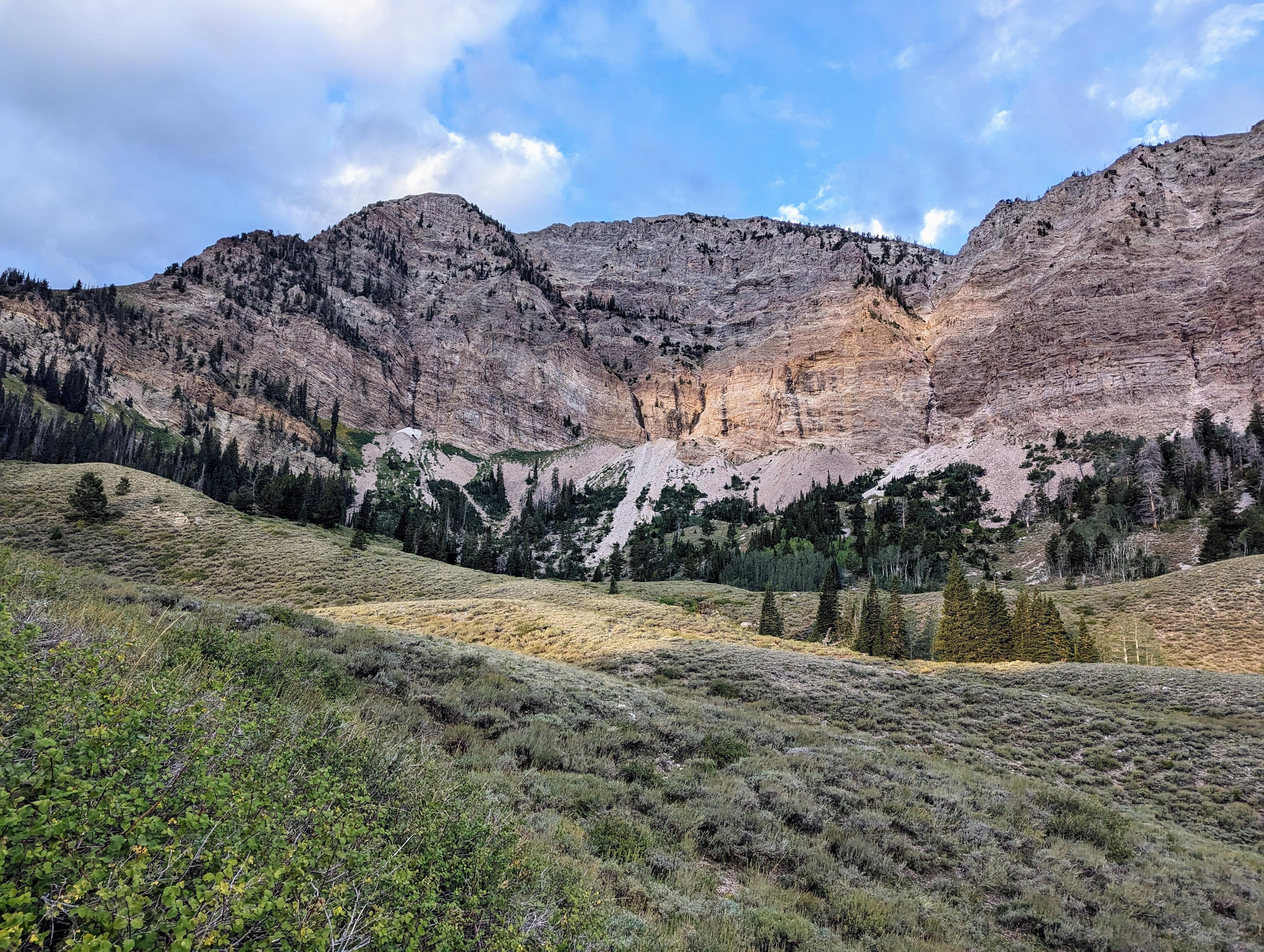 The cliffs around North Willow Lake that is tucked up and left at the base of the mountain.
