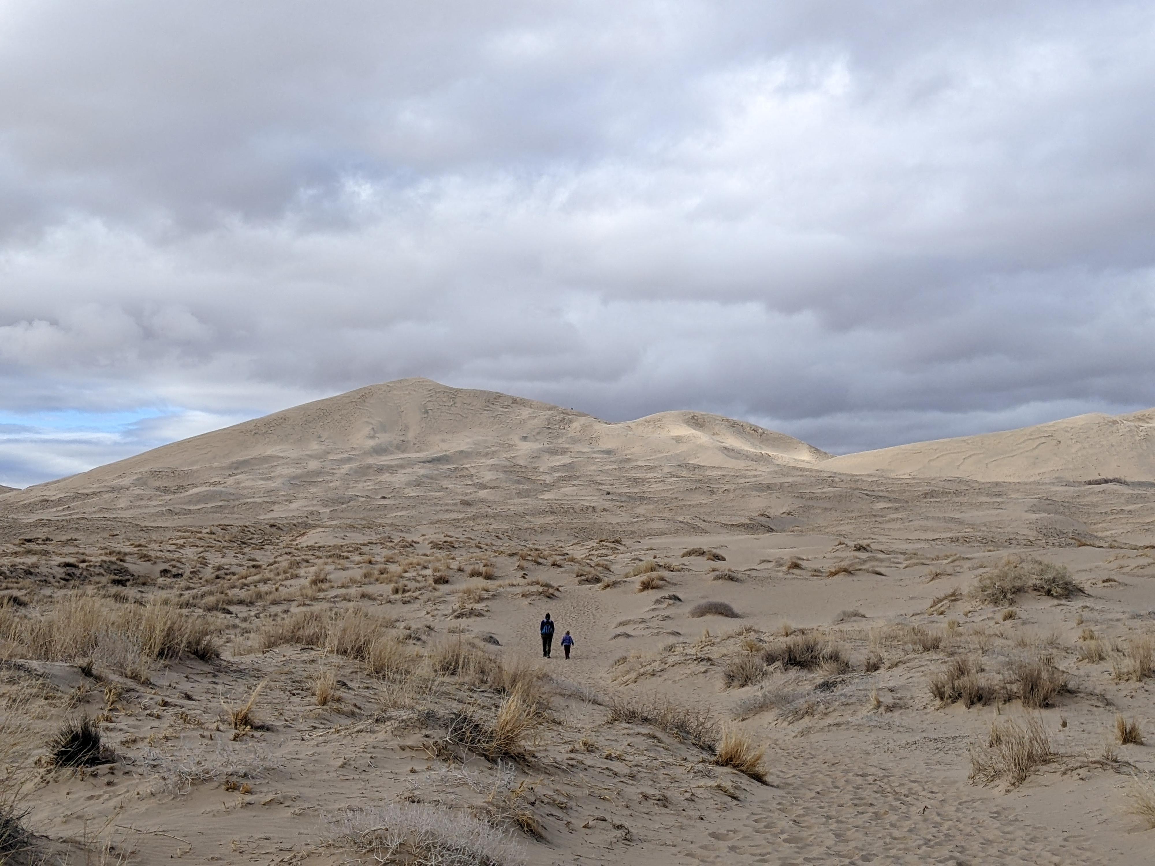 Diane and Ruby heading for the largest dune at Kelso Dunes