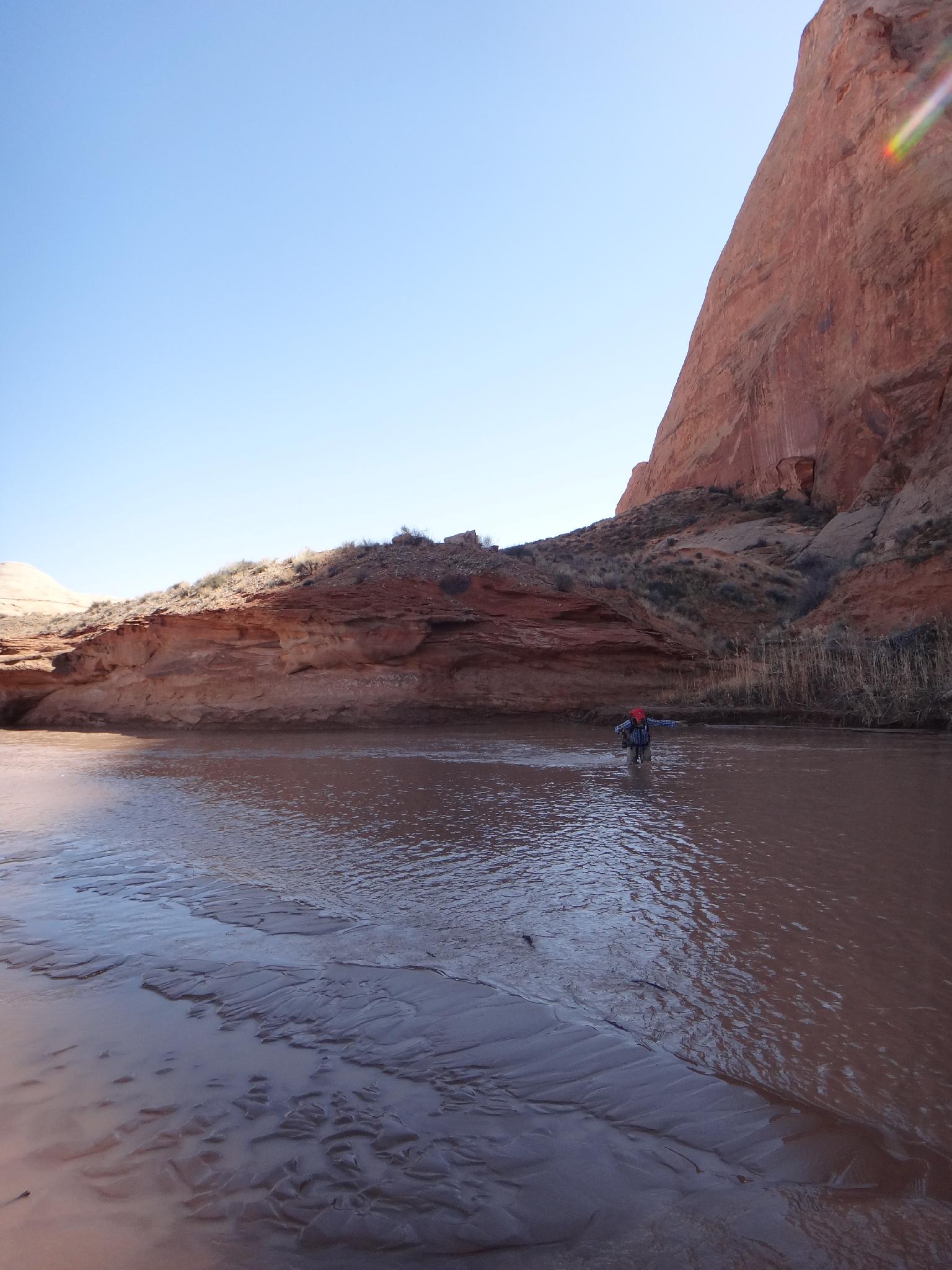 Diane pondering the choices she made to end up thigh deep in the ice cold Dirty Devil.