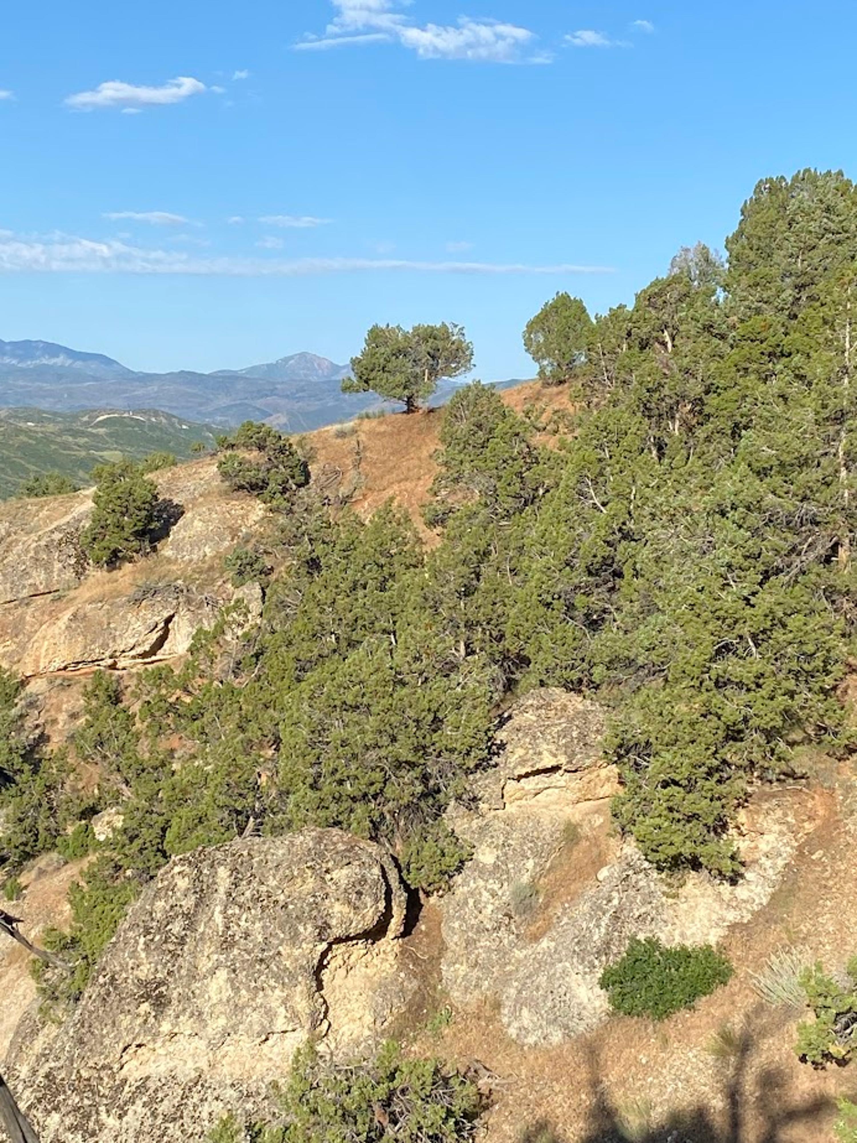 Looking back at the big juniper tree from the west ridge after taking the trail that crosses the drainages above Crumbling Canyon. That tree marks the start of the trail that heads west before you descend to canyon bottom.