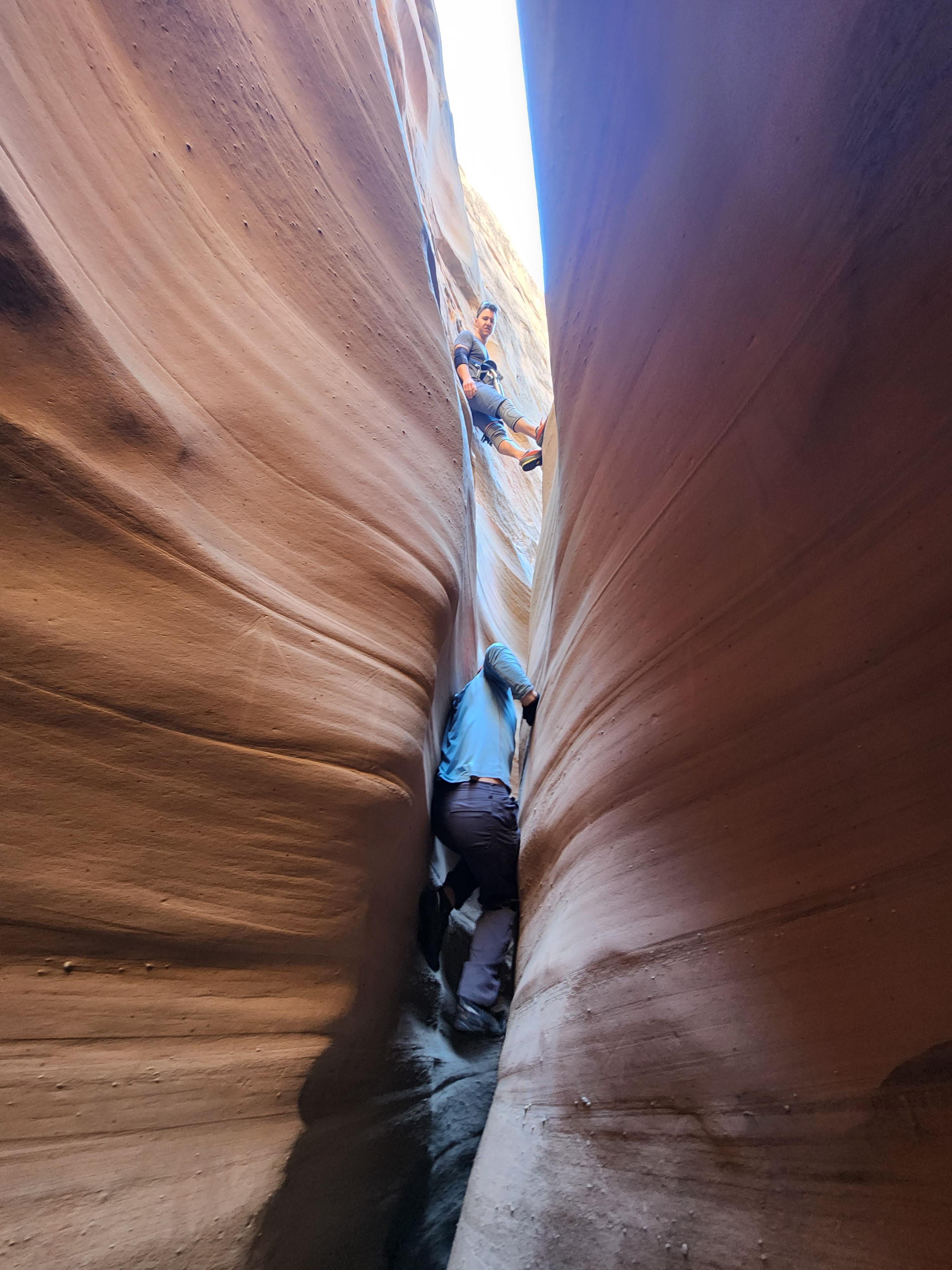 Climber in crux and climber just above and past crux.