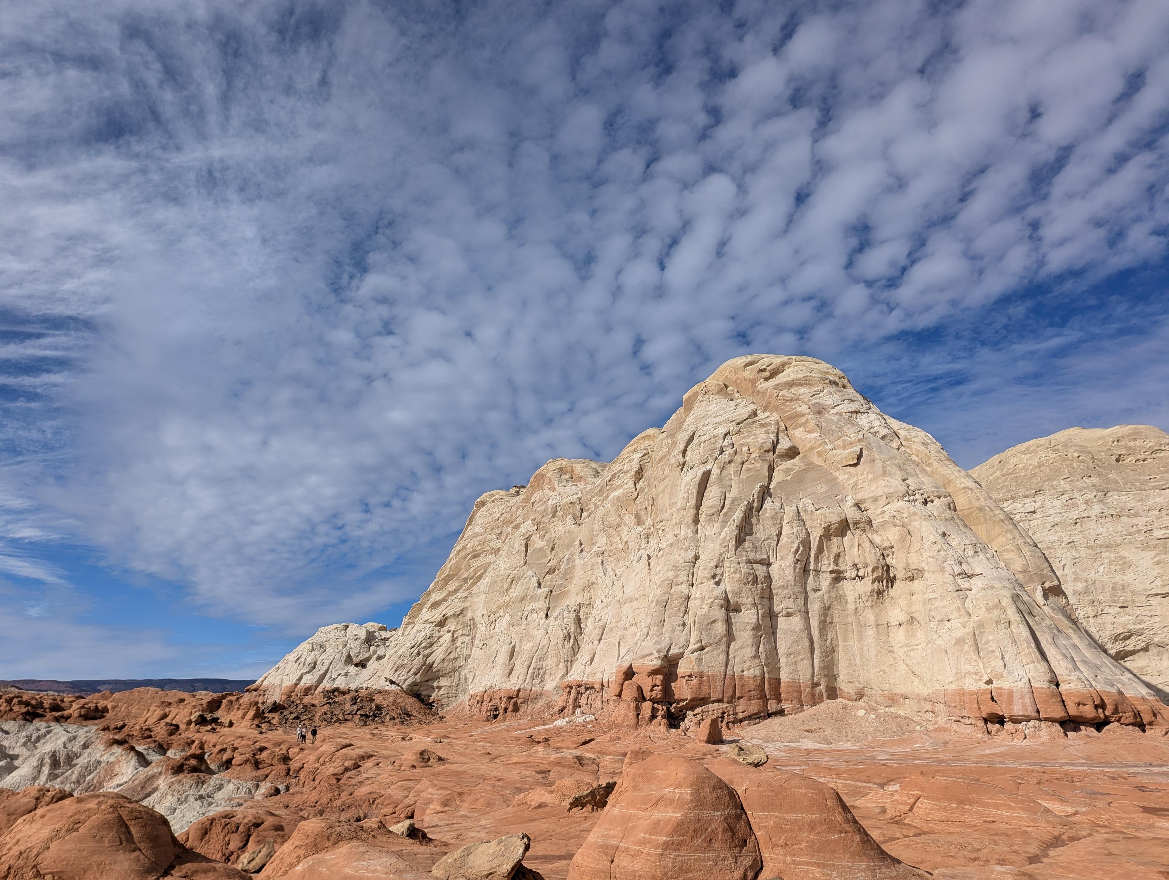 The red bench. You can see people on the left heading back from the white toadstool area.
