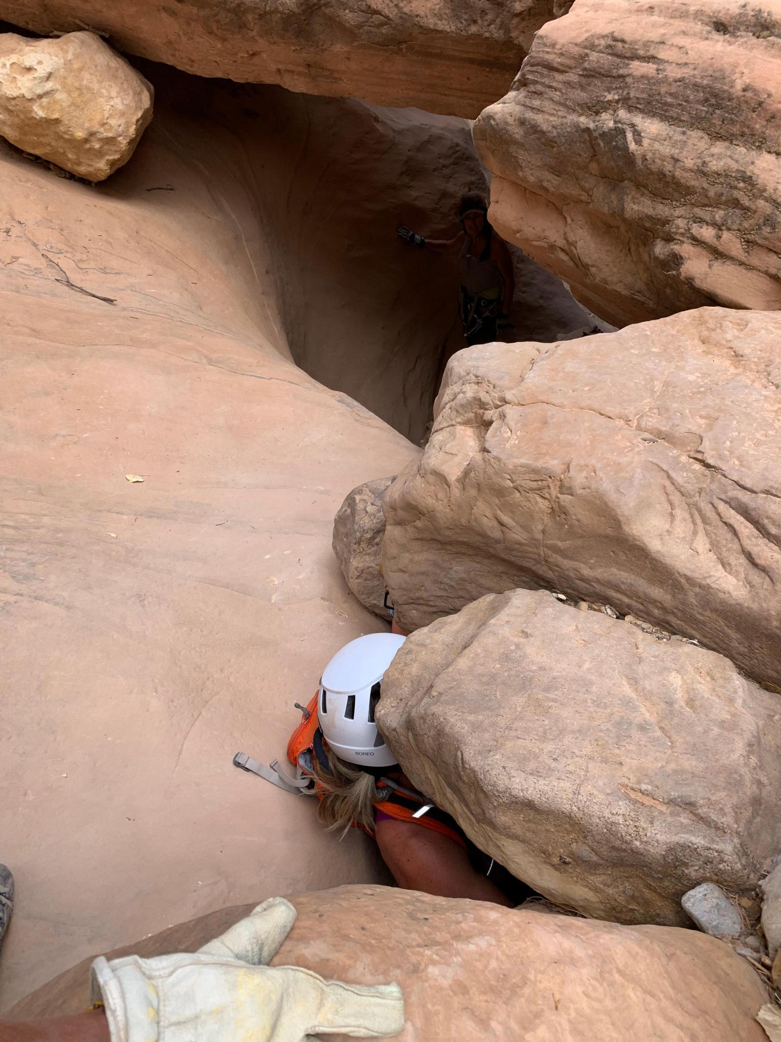 Downclimb under some boulders