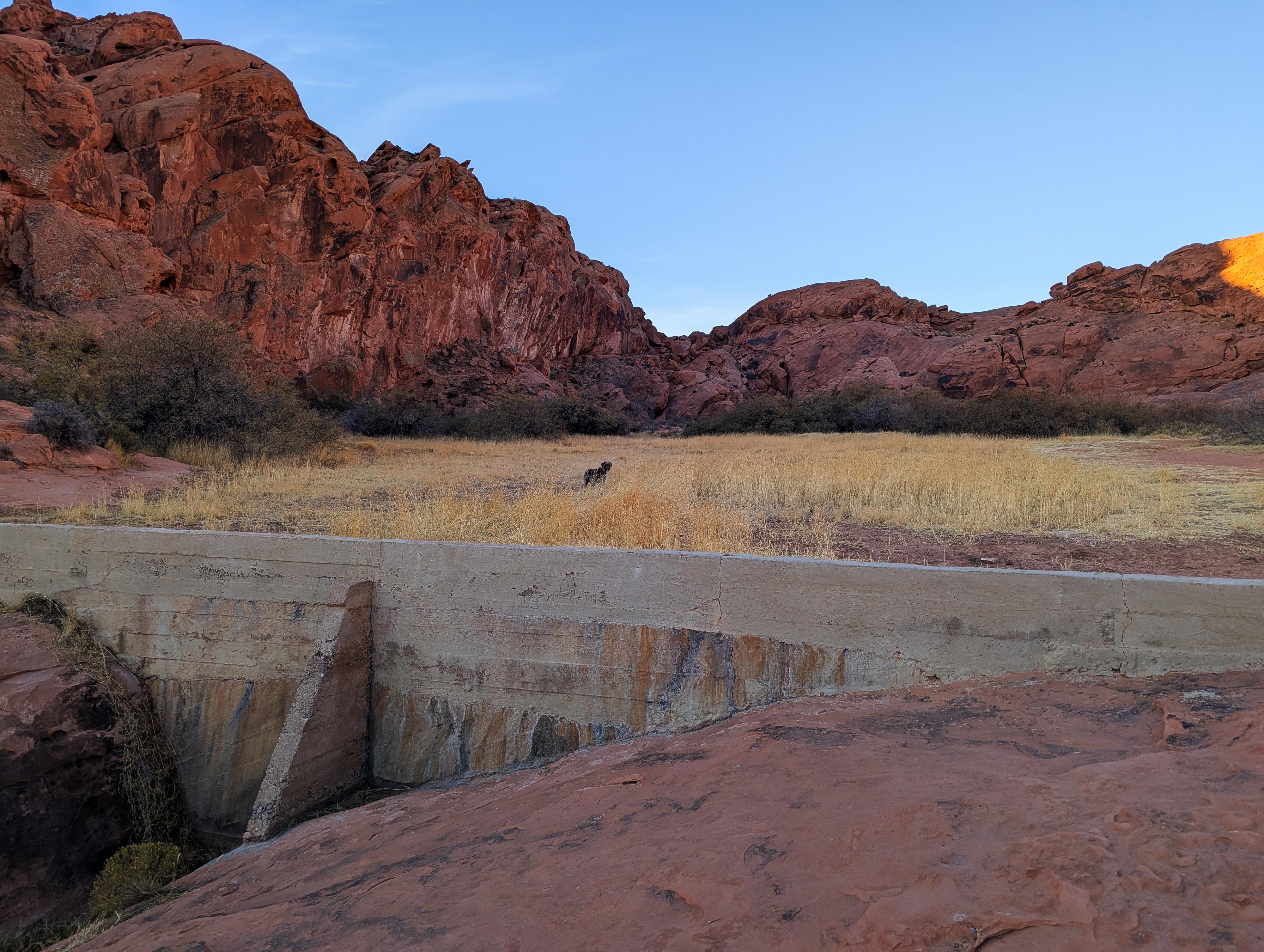 The old, large, silted in dam along the trail.