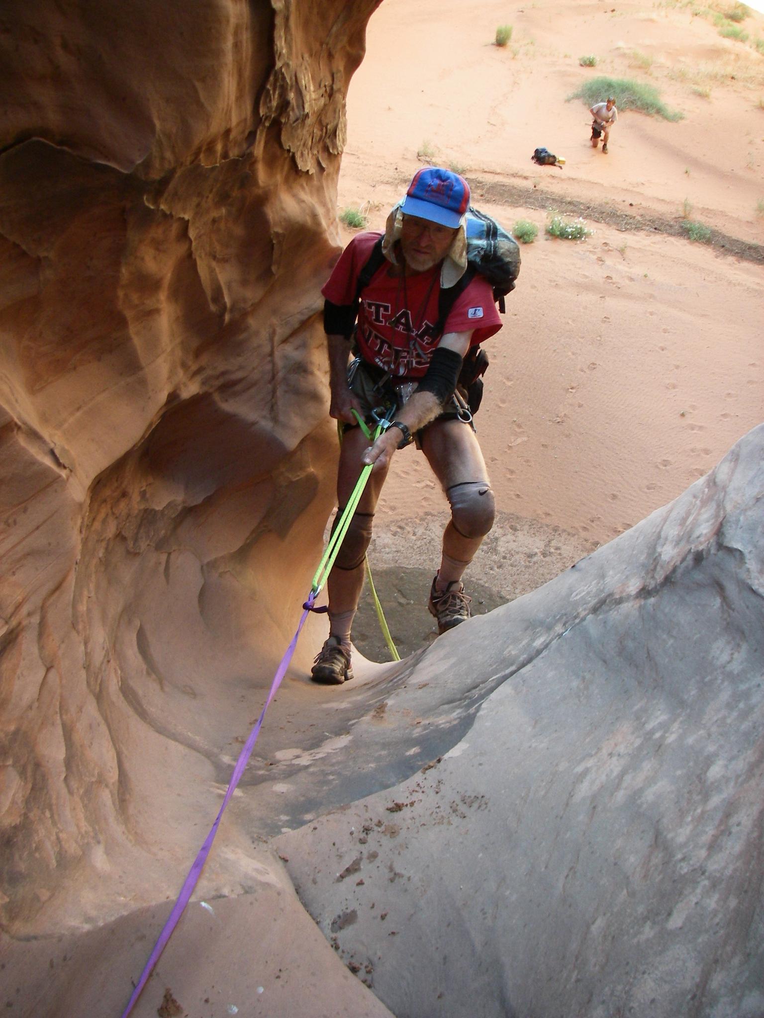Mike Kelsey doing the final rappel in Scorpion East Canyon