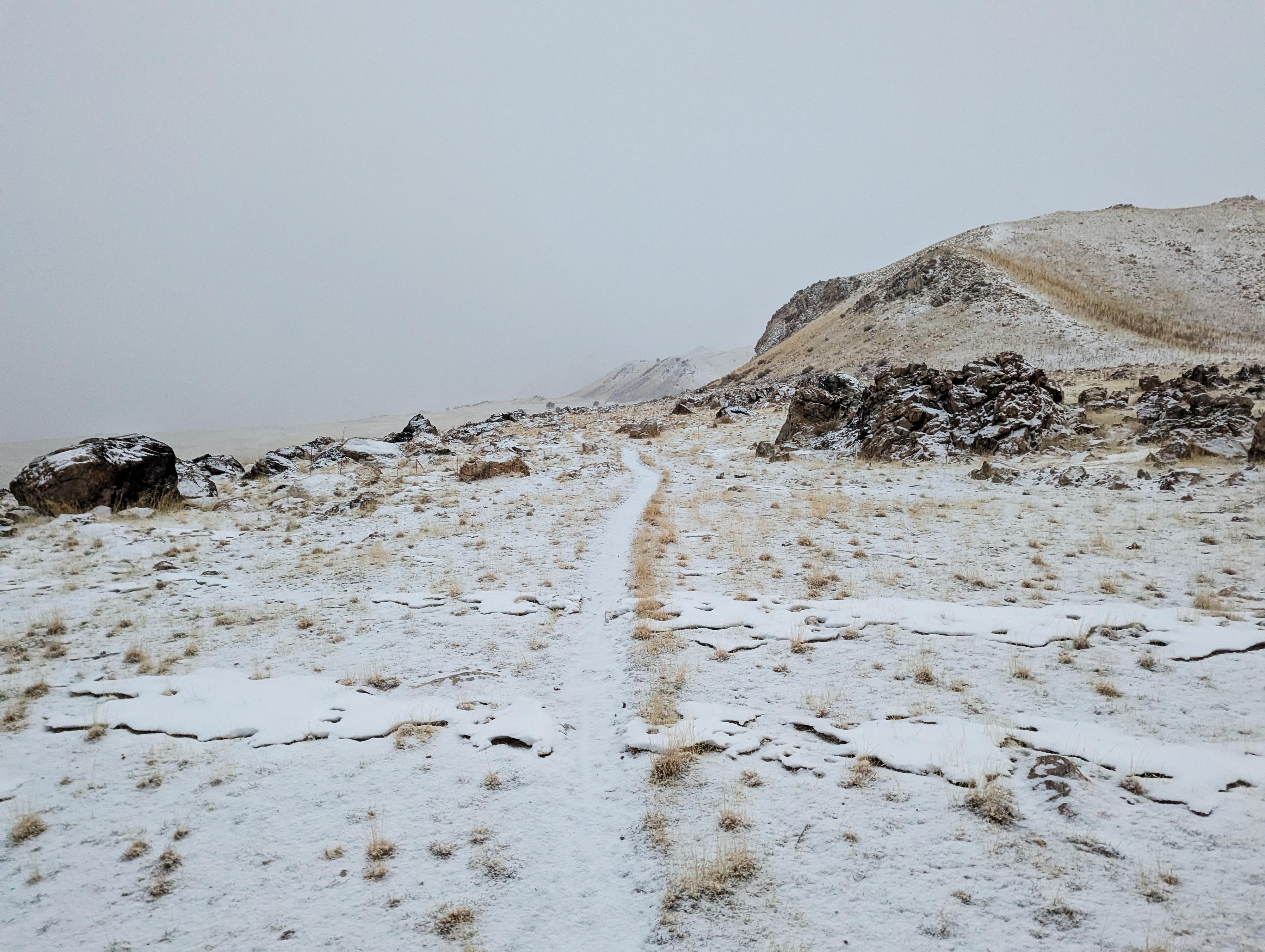 The single track on the west side of the Sentinel during a snow flurry.