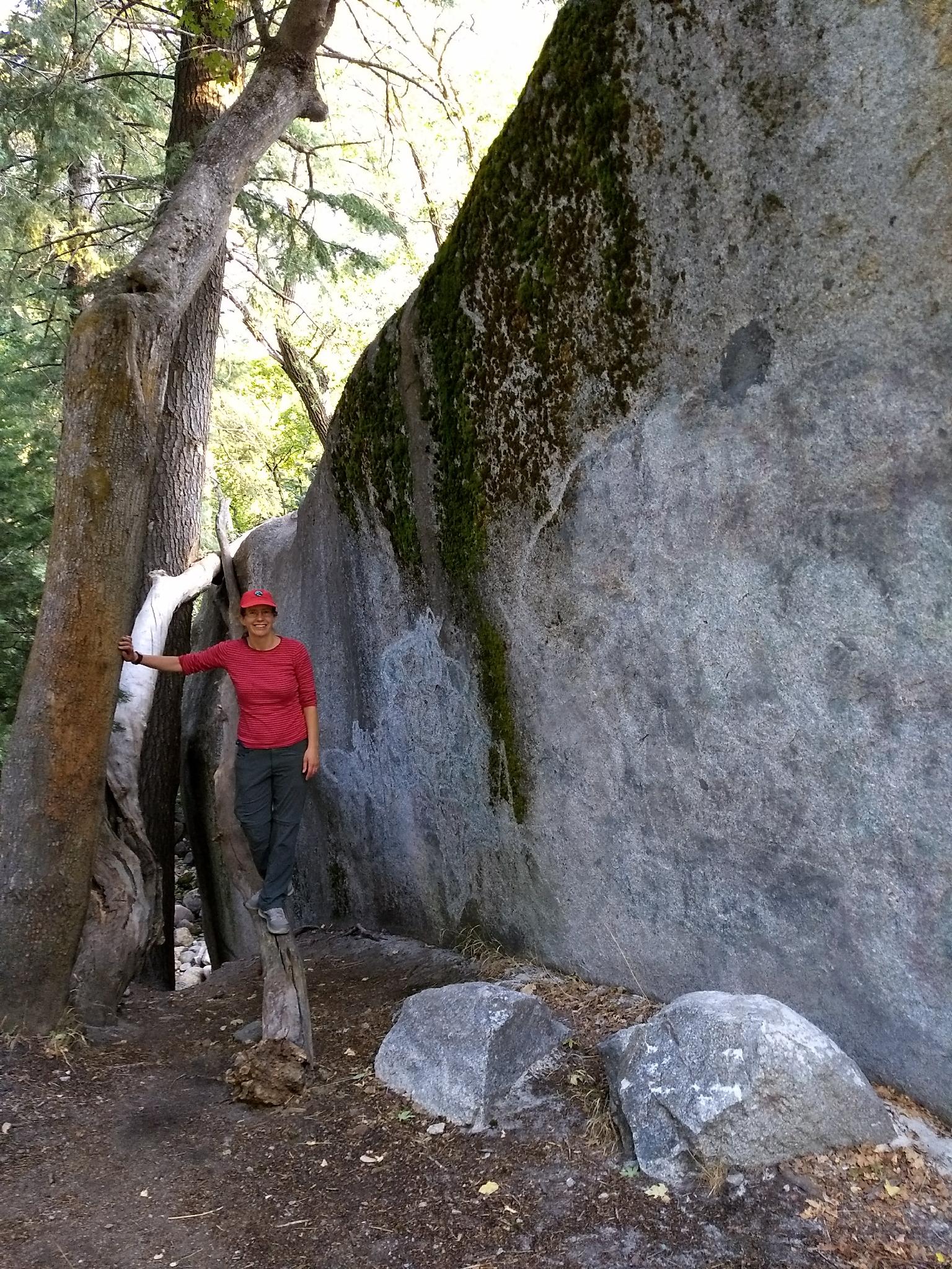 Diane contemplating a log climb onto one of the huge boulders.