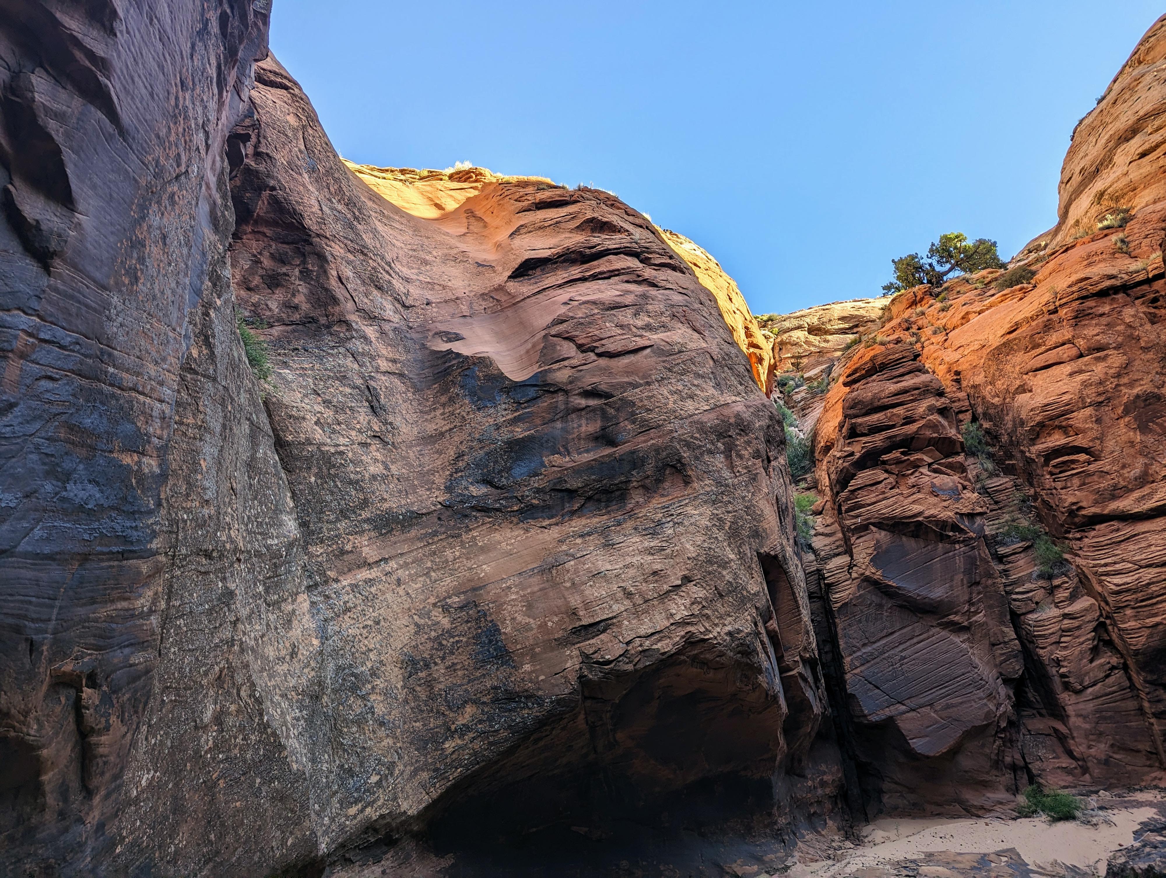 Rappel 2 on the left, downclimb gully and chimney on the right.